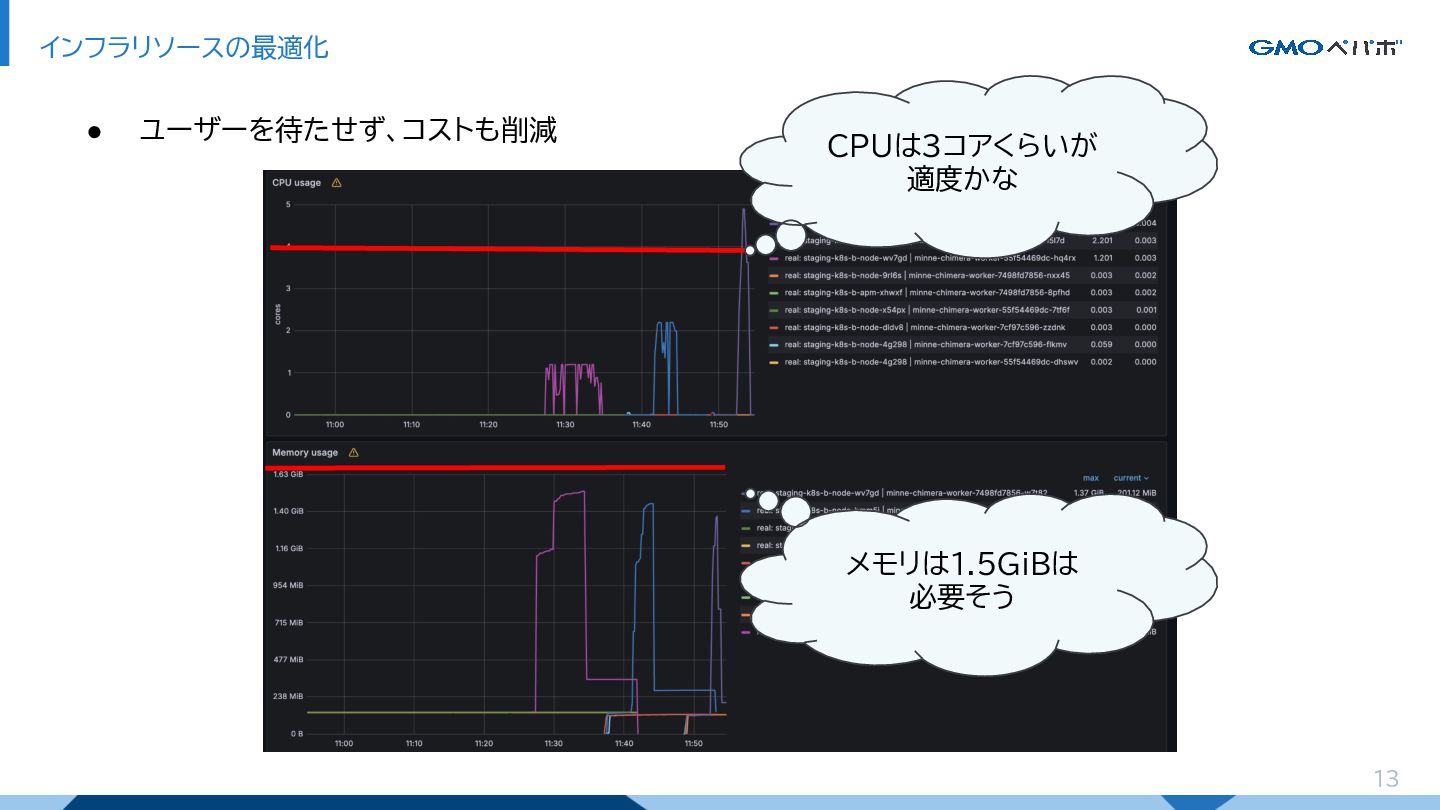 13 インフラリソースの最適化 CPUは3コアくらいが 適度かな メモリは1.5GiBは 必要そう • ユーザーを待たせず、コストも削減