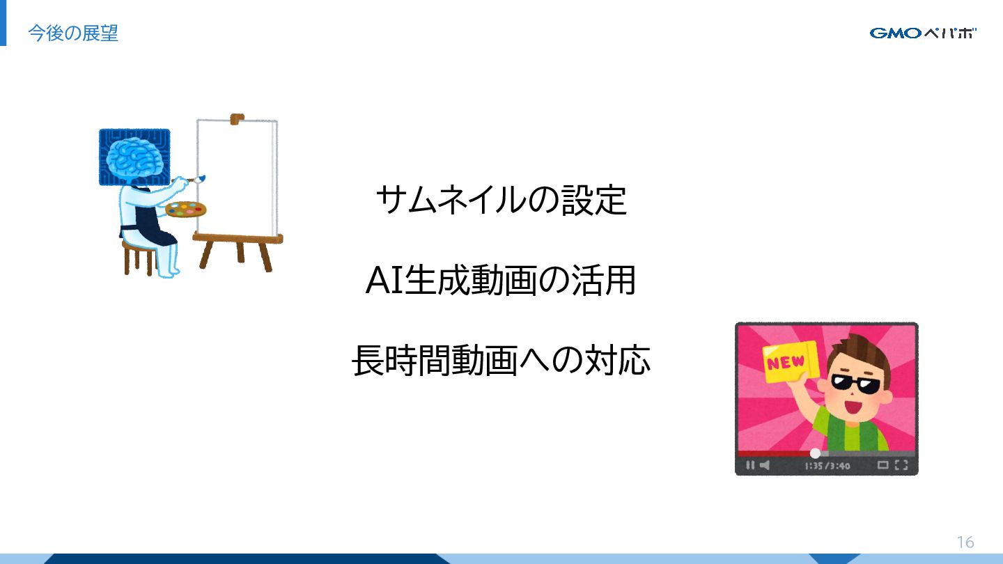 16 今後の展望 サムネイルの設定 AI生成動画の活用 長時間動画への対応