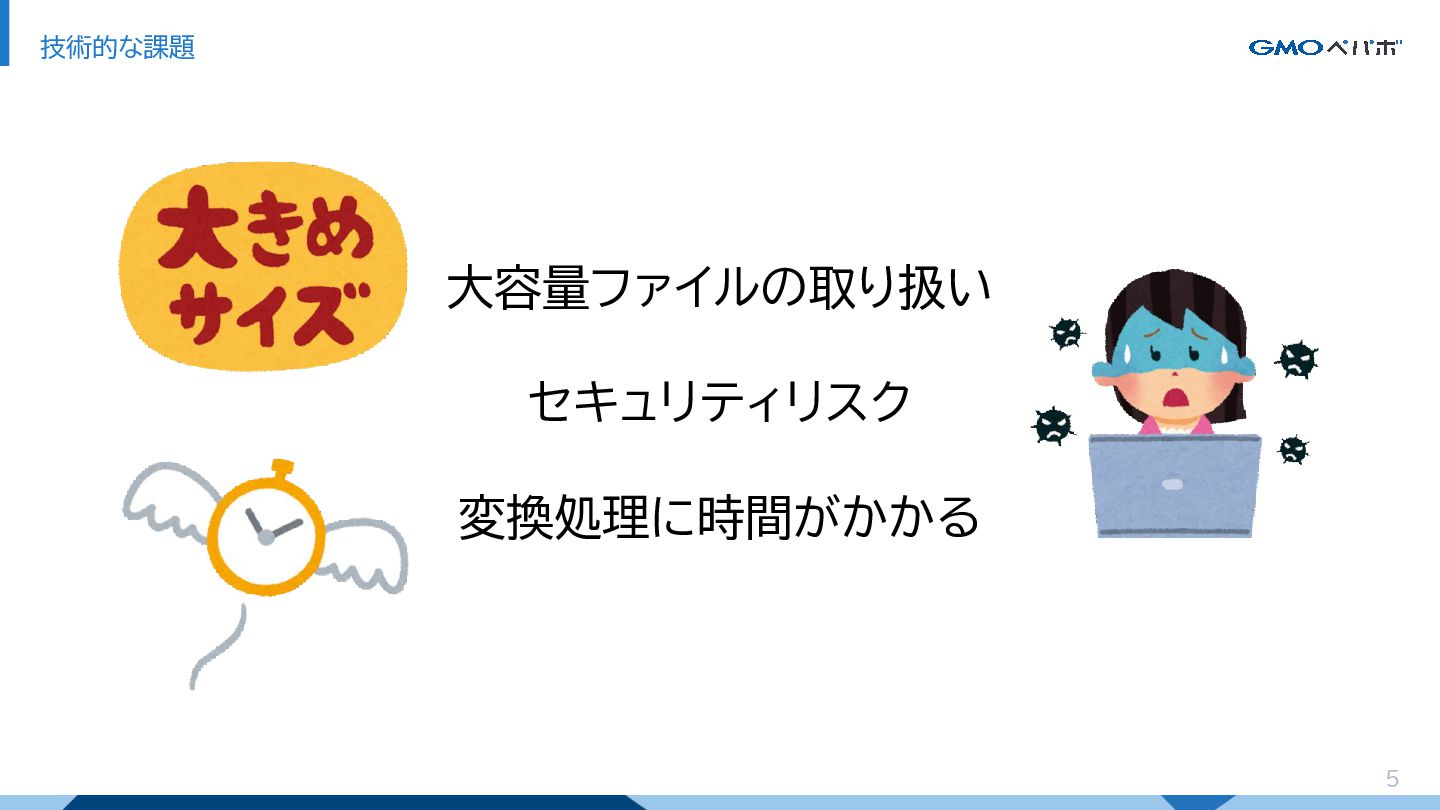 5 技術的な課題 大容量ファイルの取り扱い セキュリティリスク 変換処理に時間がかかる