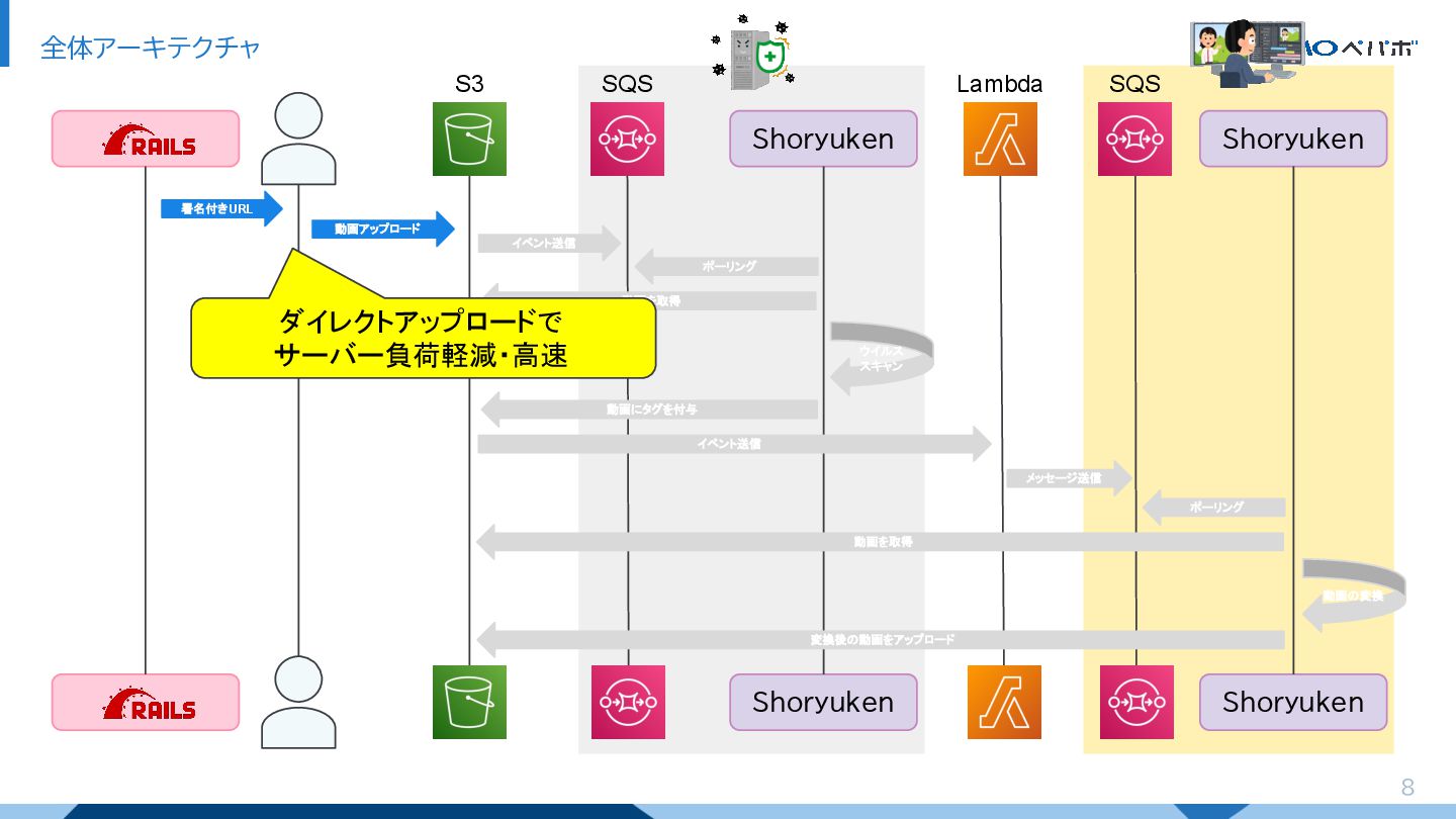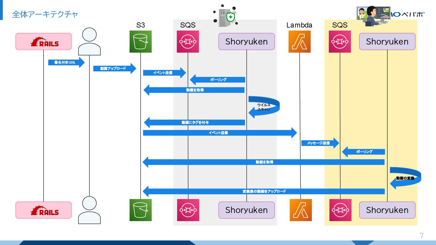 7 全体アーキテクチャ Shoryuken Shoryuken Shoryuken Shoryuken 署名付きURL 動画アップロード イベント送信 ウイルス