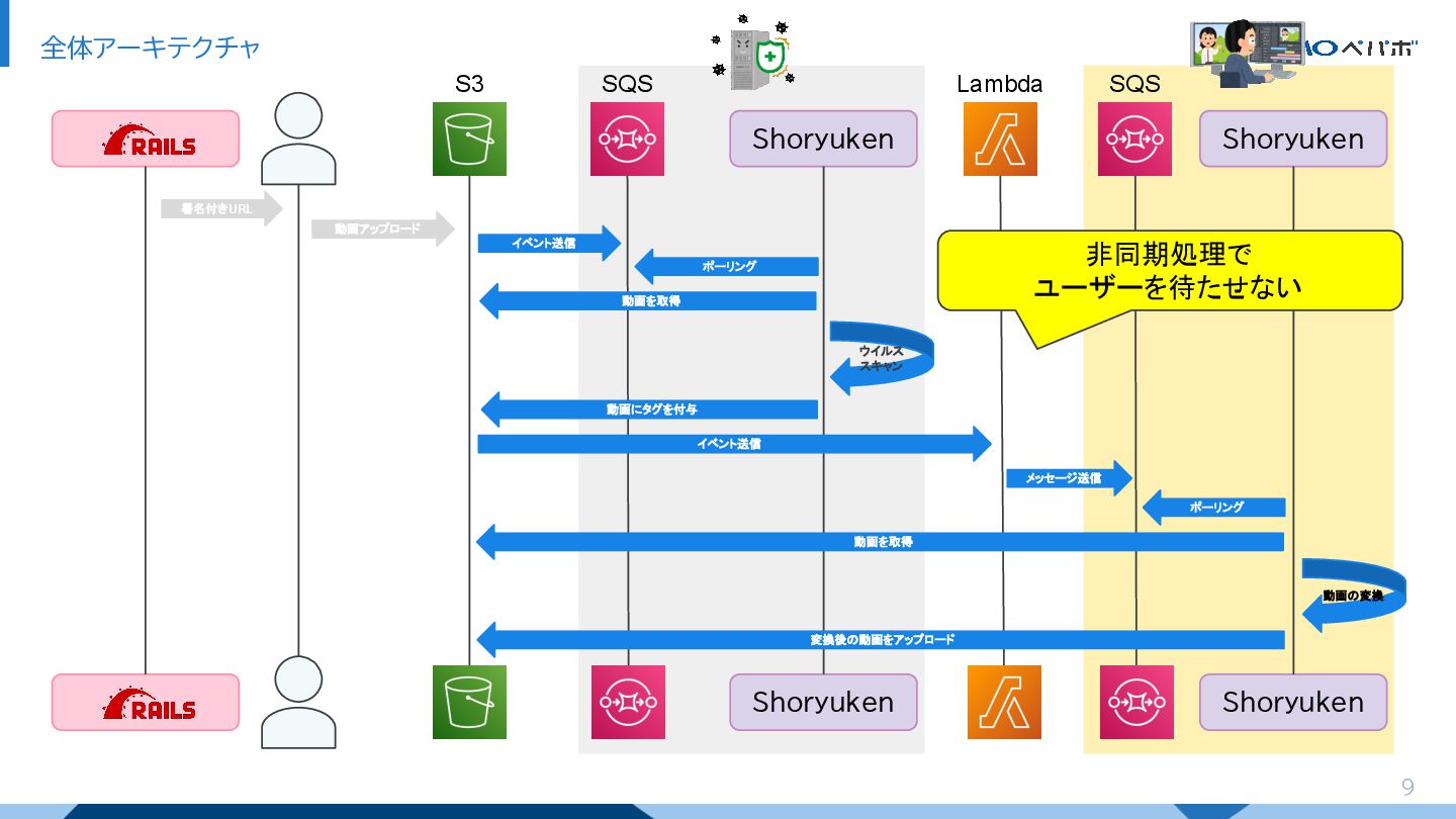 8 全体アーキテクチャ Shoryuken Shoryuken Shoryuken Shoryuken 署名付きURL 動画アップロード イベント送信 ウイルス