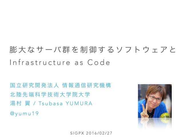 0 2 / 2 7 Va g r a n t • VM(Virtual Box)ͷCLIߏཧπʔϧ • ίϚϯυҰͭͰVMΛߏஙͨ͠ΓϩάΠϯͨ͠Γফڈͨ͠ΓͰ͖Δ • VagrantfileʹαʔόߏΛهड़ 15 config.vm.define :node1 do |node| node.vm.box = "centos6" node.vm.network :forwarded_port, guest: 22, host: 2001, id: "ssh" node.vm.network :private_network, ip: "192.168.33.11" end config.vm.define :node2 do |node| node.vm.box = "centos6" node.vm.network :forwarded_port, guest: 22, host: 2002, id: "ssh" node.vm.network :forwarded_port, guest: 80, host: 8000, id: "http" node.vm.network :private_network, ip: "192.168.33.12" end http://yteraoka.github.io/ansible-tutorial/