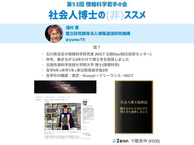 湯村 翼 国立研究開発法人情報通信研究機構 @yumu19 社会人博士の(非)ススメ 第53回 情報科学若手の会 • ੴݝࡏॅͷใՊֶݚڀऀ (NICT