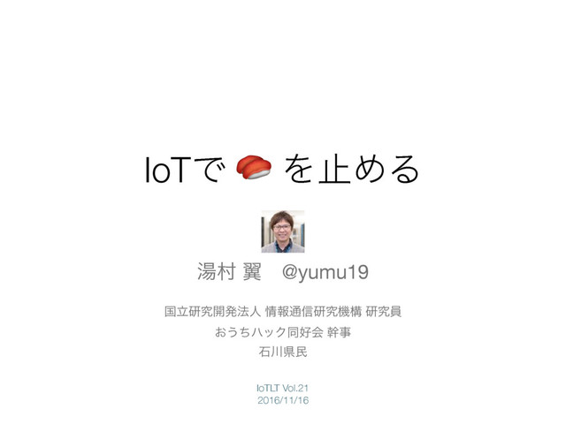 IoTͰ ΛࢭΊΔ ౬ଜ ཌྷɹ@yumu19 IoTLT Vol.21 2016/11/16 ࠃཱݚڀ։ൃ๏ਓ ใ௨৴ݚڀػߏ ݚڀһ