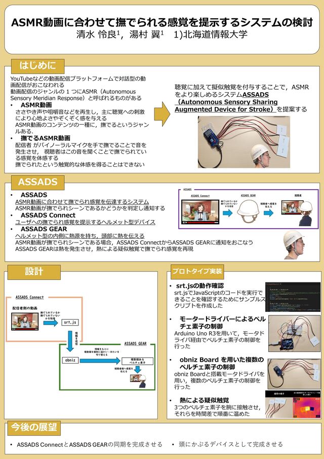 Sensory Meridian Response)と呼ばれるものがある • ASMR動画 ささやき声や咀嚼音などを再生し,主に聴覚への刺激 により心地よさやぞくぞく感を与える ASMR動画のコンテンツの一種に,撫でるというジャン ルある. • 撫でるASMR動画 配信者 がバイノーラルマイクを手で撫でることで音を 発生させ, 視聴者はこの音を聞くことで撫でられてい る感覚を体感する 撫でられたという触覚的な体感を得ることはできない 聴覚に加えて擬似触覚を付与することで,ASMR をより楽しめるシステムASSADS (Autonomous Sensory Sharing Augmented Device for Stroke)を提案する はじめに • ASSADS ASMR動画に合わせて撫でられ感覚を伝達するシステム ASMR動画が撫でられシーンであるかどうかを判定し通知する • ASSADS Connect ユーザへの撫でられ感覚を提示するヘルメット型デバイス • ASSADS GEAR ヘルメット型の内側に熱源を持ち,頭部に熱を伝える ASMR動画が撫でられシーンである場合,ASSADS ConnectからASSADS GEARに通知をおこなう ASSADS GEARは熱を発生させ,熱による疑似触覚で撫でられ感覚を再現 ASSADS • srt.jsの動作確認 srt.jsでJavaScriptのコードを実行で きることを確認するためにサンプルス クリプトを作成した • モータードライバーによるペル チェ素子の制御 Arduino Uno R3を用いて,モータド ライバ経由でペルチェ素子の制御を 行った • obniz Board を用いた複数の ペルチェ素子の制御 obniz Boardと搭載モータドライバを 用い,複数のペルチェ素子の制御を 行った • 熱による疑似触覚 3つのペルチェ素子を腕に接触させ, それらを時間差で順番に温めた プロトタイプ実装 設計 今後の展望 • 頭にかぶるデバイスとして完成させる • ASSADS ConnectとASSADS GEARの同期を完成させる