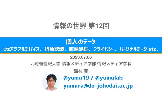 2023年7月6日(木)に開催された北海道情報大学の講義「情報の世界」の第12回「個人のデータ 〜 ウェアラブルデバイス、行動認識、画像処理、プライバシー、パーソナルデータ etc.」の講義資料