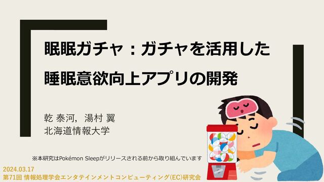 眠眠ガチャ︓ガチャを活⽤した 睡眠意欲向上アプリの開発 乾 泰河,湯村 翼 北海道情報⼤学 2024.03.17 第71回 情報処理学会エンタテインメントコンピューティング(EC)研究会 ※本研究はPokémon