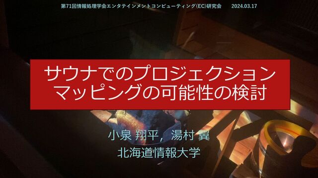 1 ⼩泉 翔平,湯村 翼 北海道情報⼤学 サウナでのプロジェクション マッピングの可能性の検討 第71回情報処理学会エンタテインメントコンピューティング(EC)研究会 2024.03.17