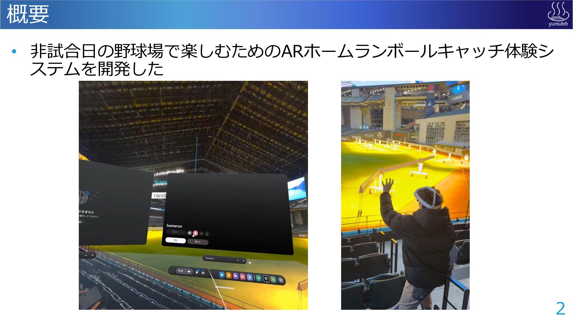 概要 • 非試合日の野球場で楽しむためのARホームランボールキャッチ体験シ ステムを開発した 2