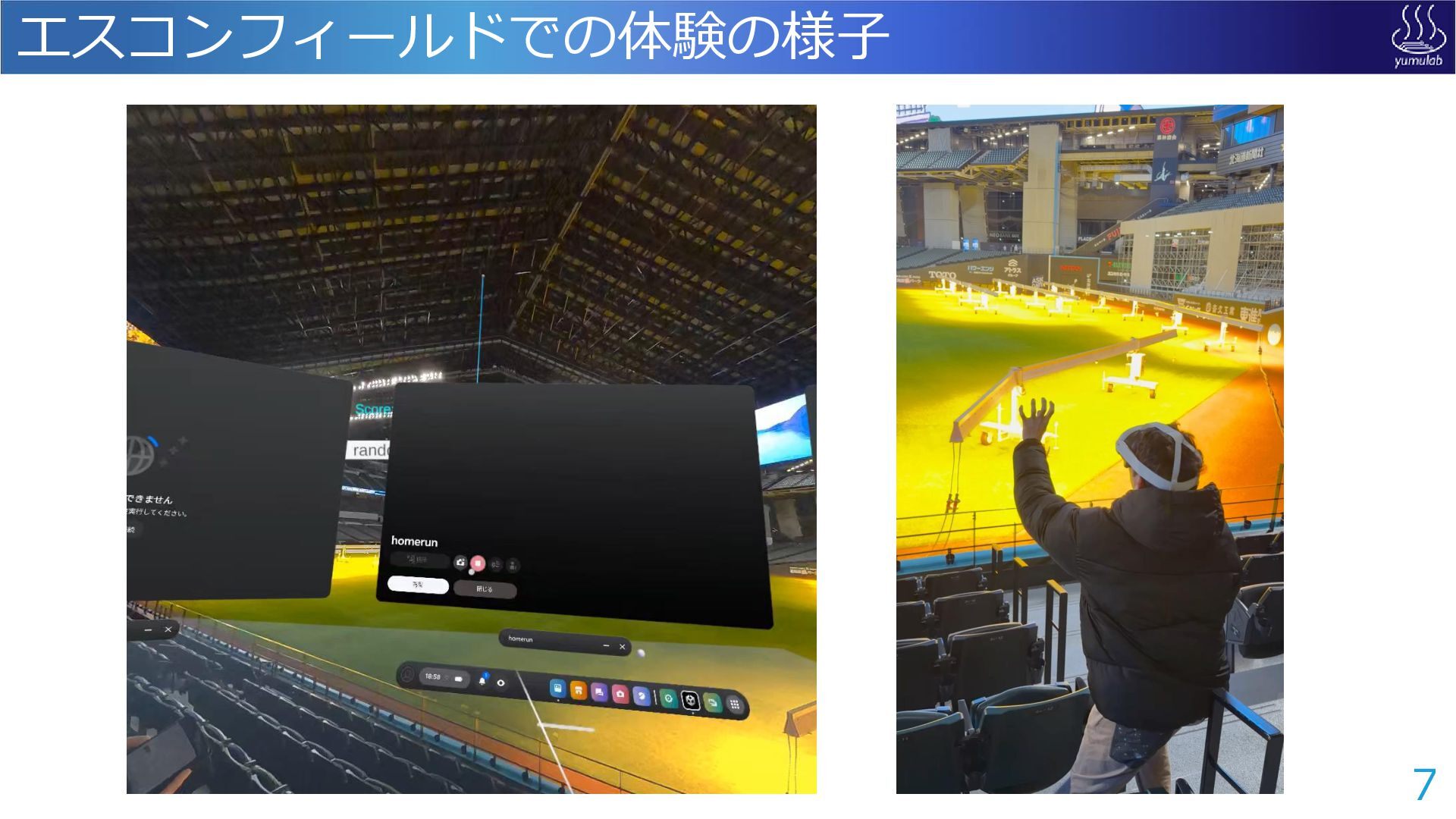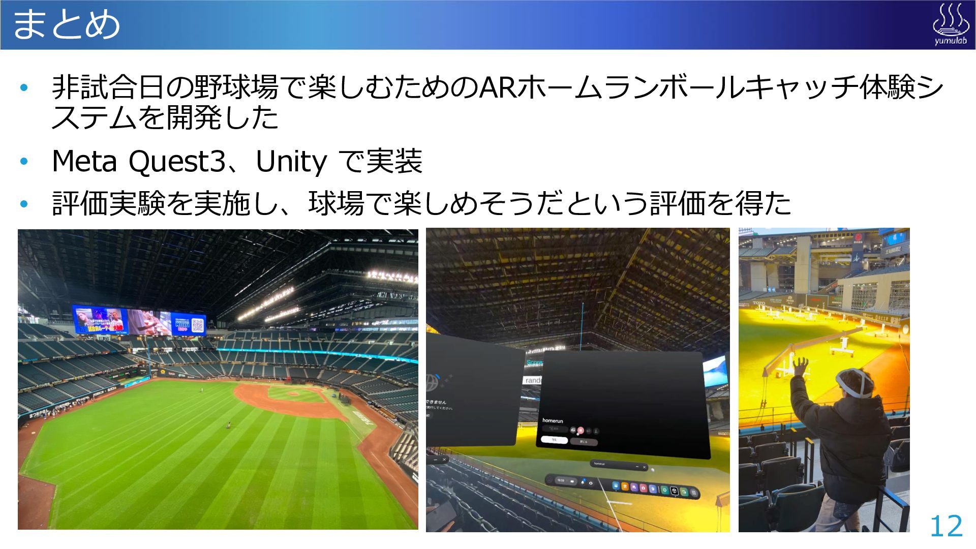 まとめ • 非試合日の野球場で楽しむためのARホームランボールキャッチ体験シ ステムを開発した • Meta Quest3、Unity で実装 • 評価実験を実施し、球場で楽しめそうだという評価を得た