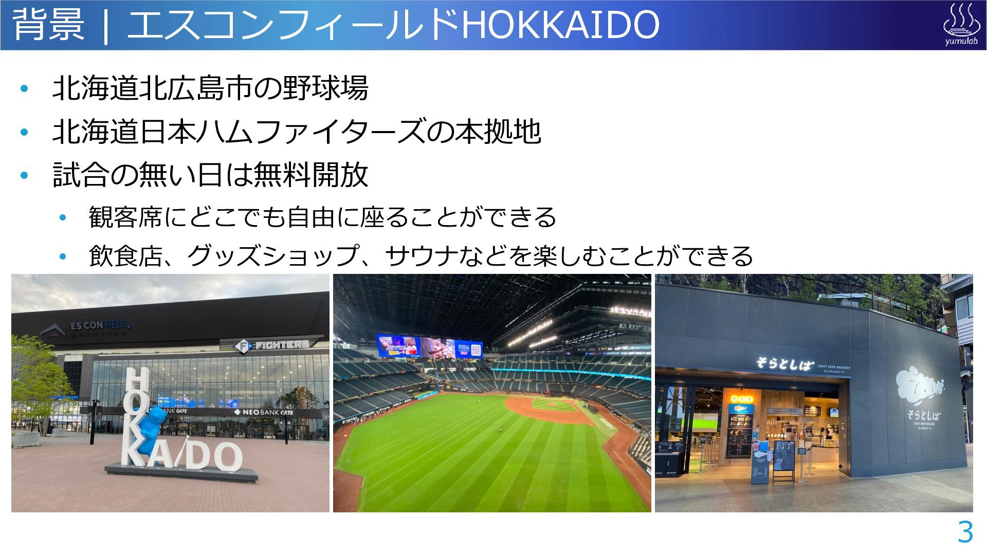 背景 | エスコンフィールドHOKKAIDO • 北海道北広島市の野球場 • 北海道日本ハムファイターズの本拠地 • 試合の無い日は無料開放 •