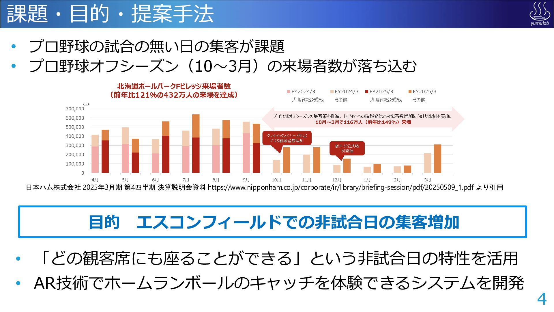 課題・目的・提案手法 • プロ野球の試合の無い日の集客が課題 • プロ野球オフシーズン(10〜3月)の来場者数が落ち込む 4 日本ハム株式会社 2025年3月期 第4四半期 決算説明会資料