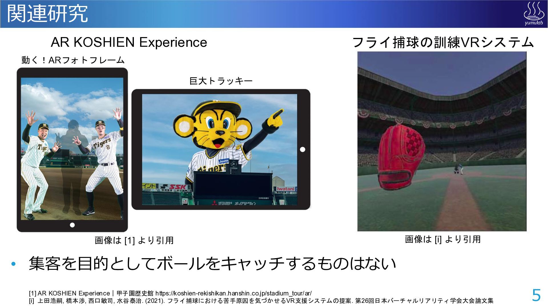 画像は [1] より引用 画像は [i] より引用 [1] AR KOSHIEN Experience|甲子園歴史館 https://koshien-rekishikan.hanshin.co.jp/stadium_tour/ar/ [i] 上田浩嗣, 橋本渉, 西口敏司, 水谷泰治. (2021). フライ捕球における苦手原因を気づかせるVR支援システムの提案. 第26回日本バーチャルリアリティ学会大会論文集