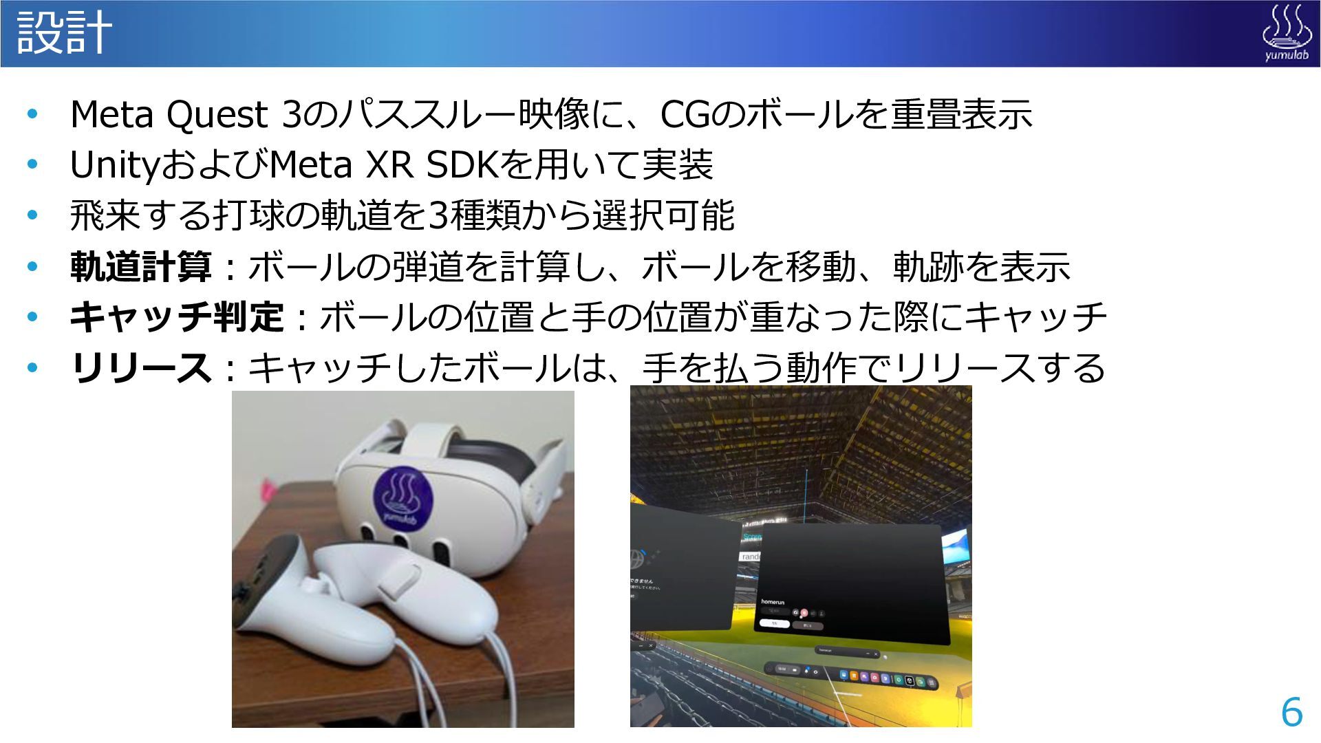 設計 • Meta Quest 3のパススルー映像に、CGのボールを重畳表示 • UnityおよびMeta XR SDKを用いて実装 •