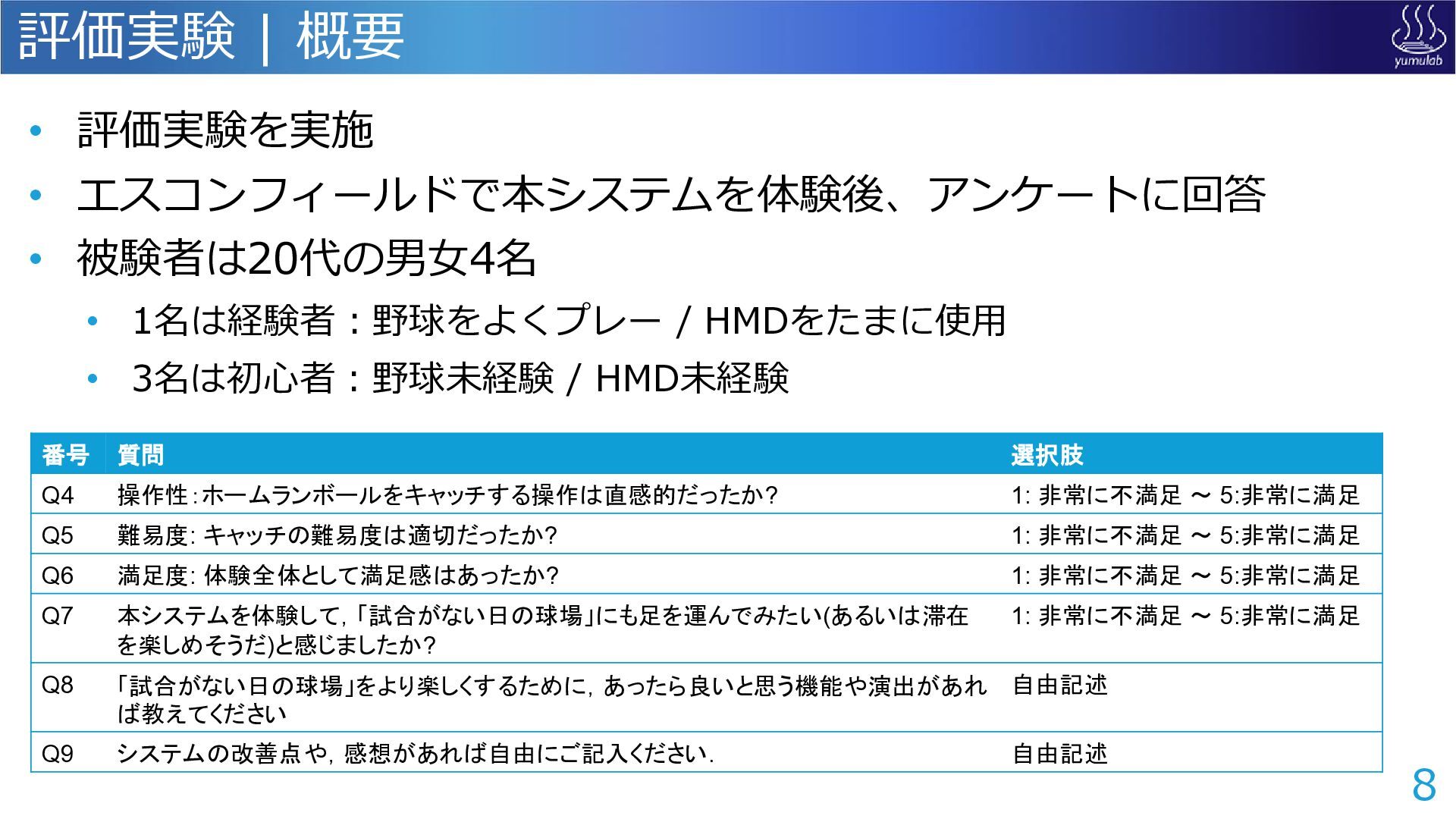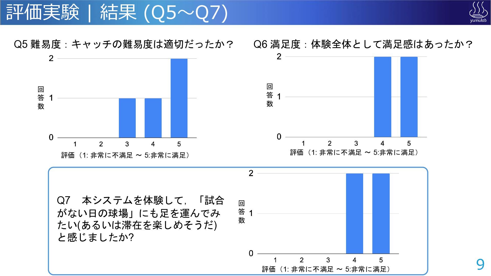 1名は経験者:野球をよくプレー / HMDをたまに使用 • 3名は初心者:野球未経験 / HMD未経験 8 番号 質問 選択肢 Q4 操作性:ホームランボールをキャッチする操作は直感的だったか? 1: 非常に不満足 〜 5:非常に満足 Q5 難易度: キャッチの難易度は適切だったか? 1: 非常に不満足 〜 5:非常に満足 Q6 満足度: 体験全体として満足感はあったか? 1: 非常に不満足 〜 5:非常に満足 Q7 本システムを体験して,「試合がない日の球場」にも足を運んでみたい(あるいは滞在 を楽しめそうだ)と感じましたか? 1: 非常に不満足 〜 5:非常に満足 Q8 「試合がない日の球場」をより楽しくするために,あったら良いと思う機能や演出があれ ば教えてください 自由記述 Q9 システムの改善点や,感想があれば自由にご記入ください. 自由記述