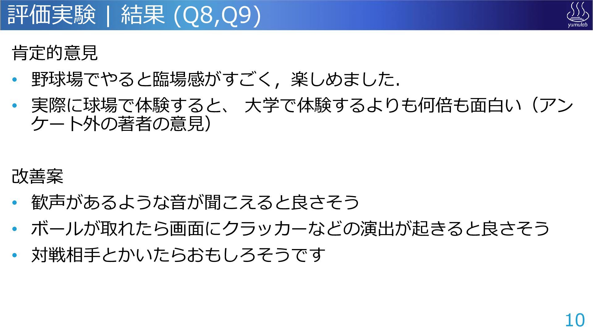 評価実験 | 結果 (Q8,Q9) 肯定的意見 • 野球場でやると臨場感がすごく,楽しめました. • 実際に球場で体験すると、 大学で体験するよりも何倍も面白い(アン