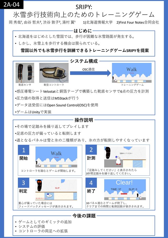 岡 秀哉, 由谷 哲夫, 渋谷 敦子, 湯村 翼. SRIPY: 氷雪路面歩行技術の向上のためのトレーニングゲーム, インタラクション2023の発表資料 https://dl.yumulab.org/papers/35