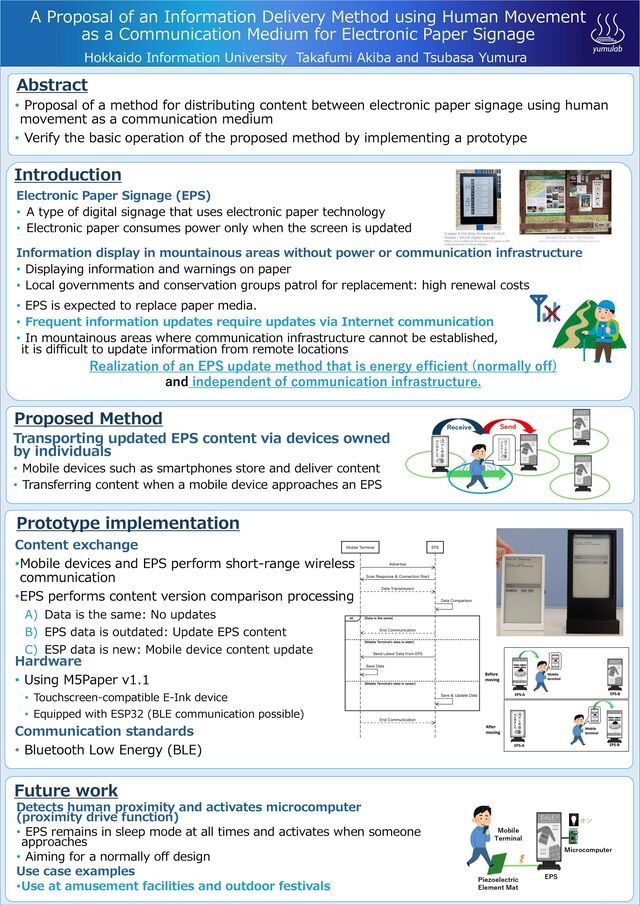 content between electronic paper signage using human movement as a communication medium • Verify the basic operation of the proposed method by implementing a prototype BB A Proposal of an Information Delivery Method using Human Movement as a Communication Medium for Electronic Paper Signage Hokkaido Information University Takafumi Akiba and Tsubasa Yumura Proposed Method Prototype implementation Abstract Electronic Paper Signage (EPS) • A type of digital signage that uses electronic paper technology • Electronic paper consumes power only when the screen is updated Information display in mountainous areas without power or communication infrastructure • Displaying information and warnings on paper • Local governments and conservation groups patrol for replacement: high renewal costs Introduction E-paper E-link Solar Powered 13.3inch Display | AVLink Digital Signage https://www.lcdhome.live/product/e-paper-e-link- solar-powered-13-3inch-display/ • EPS is expected to replace paper media. • Frequent information updates require updates via Internet communication • In mountainous areas where communication infrastructure cannot be established, it is difficult to update information from remote locations Realization of an EPS update method that is energy efficient (normally off) and independent of communication infrastructure. Transporting updated EPS content via devices owned by individuals • Mobile devices such as smartphones store and deliver content • Transferring content when a mobile device approaches an EPS BB Future work Detects human proximity and activates microcomputer (proximity drive function) • EPS remains in sleep mode at all times and activates when someone approaches • Aiming for a normally off design Use case examples •Use at amusement facilities and outdoor festivals Receive Send Hardware • Using M5Paper v1.1 • Touchscreen-compatible E-Ink device • Equipped with ESP32 (BLE communication possible) Communication standards • Bluetooth Low Energy (BLE) オン Mobile Terminal Piezoelectric Element Mat EPS Microcomputer Mändjala Study Trail | Visit Estonia https://visitestonia.com/en/mandjala-study-trail Content exchange •Mobile devices and EPS perform short-range wireless communication •EPS performs content version comparison processing A) Data is the same: No updates B) EPS data is outdated: Update EPS content C) ESP data is new: Mobile device content update