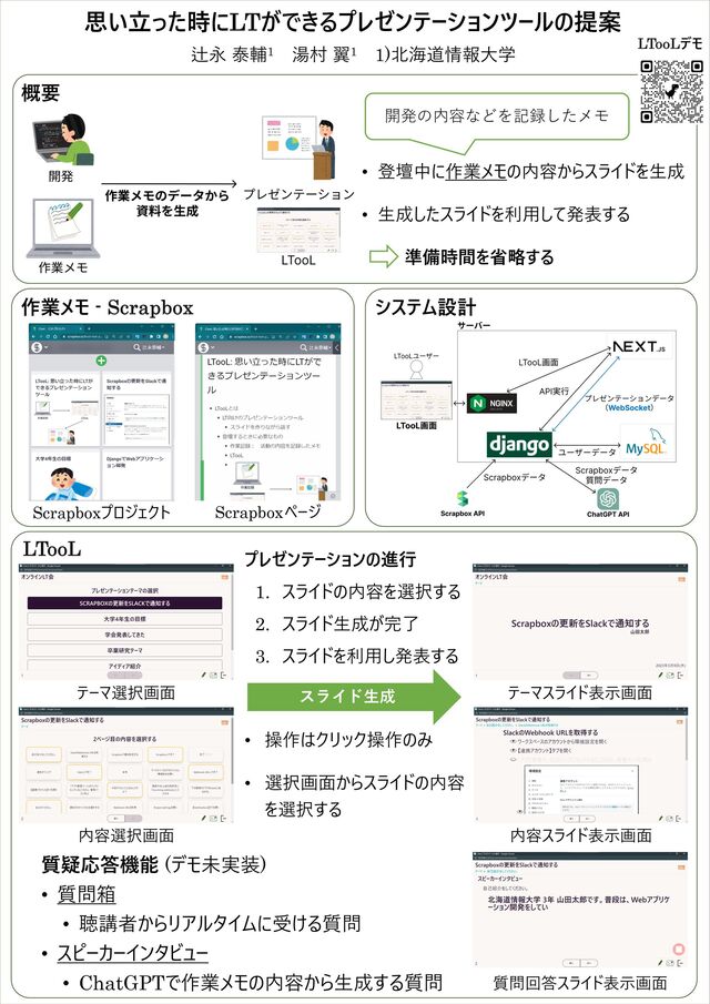 テーマスライド表⽰画⾯ 内容選択画⾯ 内容スライド表⽰画⾯ 作業メモ - Scrapbox Scrapboxプロジェクト Scrapboxページ 質問回答スライド表⽰画⾯ システム設計 • 登壇中に作業メモの内容からスライドを⽣成 • ⽣成したスライドを利⽤して発表する 準備時間を省略する 質疑応答機能 (デモ未実装) • 質問箱 • 聴講者からリアルタイムに受ける質問 • スピーカーインタビュー • ChatGPTで作業メモの内容から⽣成する質問 スライド⽣成 • 操作はクリック操作のみ • 選択画⾯からスライドの内容 を選択する プレゼンテーションの進⾏ 1. スライドの内容を選択する 2. スライド⽣成が完了 3. スライドを利⽤し発表する 開発の内容などを記録したメモ
