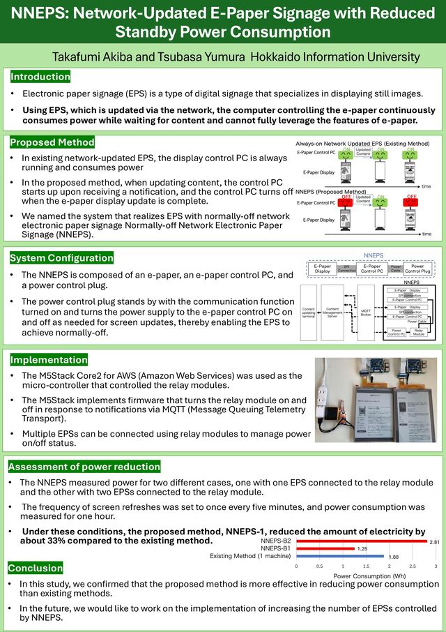 Akiba and Tsubasa Yumura Hokkaido Information University Introduction • Electronic paper signage (EPS) is a type of digital signage that specializes in displaying still images. • Using EPS, which is updated via the network, the computer controlling the e-paper continuously consumes power while waiting for content and cannot fully leverage the features of e-paper. Proposed Method • In existing network-updated EPS, the display control PC is always running and consumes power • In the proposed method, when updating content, the control PC starts up upon receiving a notification, and the control PC turns off when the e-paper display update is complete. • We named the system that realizes EPS with normally-off network electronic paper signage Normally-off Network Electronic Paper Signage (NNEPS). System Configuration • The NNEPS is composed of an e-paper, an e-paper control PC, and a power control plug. • The power control plug stands by with the communication function turned on and turns the power supply to the e-paper control PC on and off as needed for screen updates, thereby enabling the EPS to achieve normally-off. Conclusion • In this study, we confirmed that the proposed method is more effective in reducing power consumption than existing methods. • In the future, we would like to work on the implementation of increasing the number of EPSs controlled by NNEPS. Assessment of power reduction • The NNEPS measured power for two different cases, one with one EPS connected to the relay module and the other with two EPSs connected to the relay module. • The frequency of screen refreshes was set to once every five minutes, and power consumption was measured for one hour. • Under these conditions, the proposed method, NNEPS-1, reduced the amount of electricity by about 33% compared to the existing method. Implementation • The M5Stack Core2 for AWS (Amazon Web Services) was used as the micro-controller that controlled the relay modules. • The M5Stack implements firmware that turns the relay module on and off in response to notifications via MQTT (Message Queuing Telemetry Transport). • Multiple EPSs can be connected using relay modules to manage power on/off status. 2.81 1.25 1.88