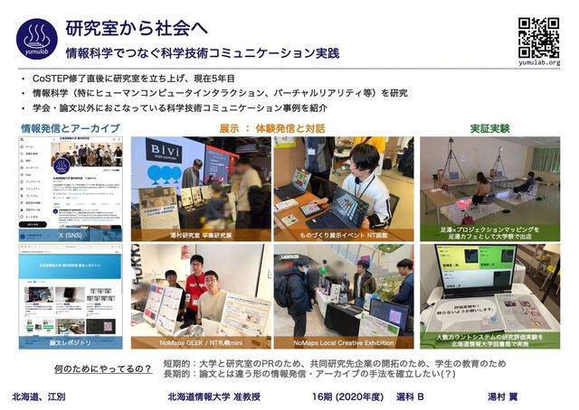 • ใՊֶʢಛʹώϡʔϚϯίϯϐϡʔλΠϯλϥΫγϣϯɺόʔνϟϧϦΞϦςΟʣΛݚڀ • ֶձɾจҎ֎ʹ͓͜ͳ͍ͬͯΔՊֶٕज़ίϛϡχέʔγϣϯࣄྫΛհ ظతɿେֶͱݚڀࣨͷ13ͷͨΊɺڞಉݚڀઌاۀͷ։ͷͨΊɺֶੜͷڭҭͷͨΊ ظతɿจͱҧ͏ܗͷใൃ৴ɾΞʔΧΠϒͷख๏Λཱ͍֬ͨ͠ ʁ ԿͷͨΊʹͬͯΔͷʁ ใൃ৴ͱΞʔΧΠϒ 9 4/4 จϨϙδτϦ /P.BQT(&&,/5ࡳຈNJOJ /P.BQT-PDBM$SFBUJWF&YIJCJUJPO ౬ଜݚڀࣨଔۀݚڀల ͷͮ͘ΓలࣔΠϕϯτ/5വؗ లࣔɿମݧൃ৴ͱର ਓΧϯτγεςϜͷݚڀධՁ࣮ݧΛ ւಓใେֶਤॻؗͰ࣮ࢪ ౬ºϓϩδΣΫγϣϯϚοϐϯάΛ ౬ΧϑΣͱͯ͠େֶࡇͰग़ళ ࣮ূ࣮ݧ yumulab.org