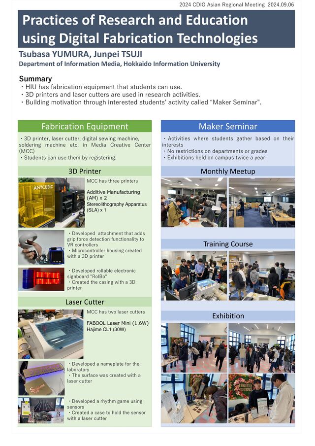 YUMURA, Junpei TSUJI Summary ・HIU has fabrication equipment that students can use. ・3D printers and laser cutters are used in research activities. ・Building motivation through interested students’ activity called “Maker Seminar”. 2024 CDIO Asian Regional Meeting 2024.09.06 Department of Information Media, Hokkaido Information University ・Activities where students gather based on their interests ・No restrictions on departments or grades ・Exhibitions held on campus twice a year Maker Seminar Monthly Meetup Training Course Exhibition Fabrication Equipment 3D Printer ・3D printer, laser cutter, digital sewing machine, soldering machine etc. in Media Creative Center (MCC) ・Students can use them by registering. Laser Cutter ・Developed attachment that adds grip force detection functionality to VR controllers ・Microcontroller housing created with a 3D printer ・Developed rollable electronic signboard "RolBo" ・Created the casing with a 3D printer ・Developed a nameplate for the laboratory ・The surface was created with a laser cutter ・Developed a rhythm game using sensors ・Created a case to hold the sensor with a laser cutter MCC has three printers Additive Manufacturing (AM) x 2 Stereolithography Apparatus (SLA) x 1 MCC has two laser cutters FABOOL Laser Mini (1.6W) Hajime CL1 (30W)