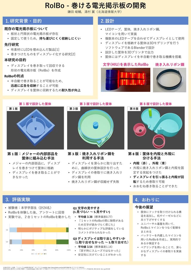 1. 研究背景・⽬的 [1] 株式会社シロ産業, “フレキシブルLED電光掲示板,” [オンライン]. Available: https://shop.webshiro.com/item/M2539FB-2R/. [アクセス日: 2023/9/1] [2] 鈴永紗也, 藤田和之, 白井僚, 伊藤雄一, “CoiLED Display: 対象に巻きつけ可能なストライプ状フレキシブルディスプレイ,” 日本バーチャルリアリティ学会論文誌, 2021,Vol.26, No.4, pp.230-240 既存の電光掲⽰板について 先⾏研究 • 布素材にLEDを埋め込んだ製品[1] • 巻きつけたものをディスプレイ化する研究[2] RolBoの利点 • 半⾃動で巻き取ることが可能なため、 迅速に広告を収納することが可能 • ディスプレイを筐体に収納するため耐久性が向上 本研究の⽬的 • ディスプレイを巻き取って回収できる 形状の電光掲⽰板(RolBo)を作成 2. 設計 • LEDテープ,筐体,焼き⼊れリボン鋼, マイコンを⽤いて実装 • 複数本のLEDテープを合わせてディスプレイとして使⽤ • ディスプレイを格納する筐体は3Dモデリングを⾏う ソフトウェアであるBlenderで設計 • 設計した筐体を3Dプリンタで出⼒ • 筐体にはディスプレイを半⾃動で巻き取る機構を搭載 ⽂字(HIU)を表⽰したRolBo 焼き⼊れリボン鋼 第 1 版で設計した筐体 第 1 版:メジャーの内部部品を 筐体に組み込む⼿法 • メジャーの内部部品に,ディスプ レイを巻きつけて筐体に格納 • ディスプレイを巻き取ることがで きなかった 第 3 版:焼き⼊れリボン鋼を 利⽤する⼿法 • ディスプレイを滑らかに取り出すた めに、曲線状の筐体設計を⾏った • ディスプレイの巻取りに焼き⼊れリ ボン鋼を利⽤ • 焼き⼊れリボン鋼が収縮せず失敗 第 3 版で設計した筐体 第 8 版:筐体を内殻と外殻に 分ける⼿法 • 内殻(⾚),外殻(⻘) • 外殻に焼き⼊れリボン鋼と内殻を固 定する突起をつけた • ディスプレイを引っ張ると内殻が回 転するため巻取り可能 • おおむね巻き取ることができた 第 8 版で設計した筐体 3. 評価実験 • 被験者:本学学部⽣(計24名) • RolBoを体験した後、アンケートに回答 • 実験では、2台1セットのRolBoを動かした 4. おわりに 今後の展望 • 筐体にフックを取り付けられる構 造を追加し,机やイーゼルなどに 吊り下げやすくする • ユニバーサル基盤を⽤いて、 RolBoとマイコンをつなぐ配線を まとめる • バッテリーを内蔵したマイコンを ⽤いたRolBoを作成し、実⽤的で あるか検証する • ベアリングを⽤いることで、滑ら かなディスプレイの巻取りを実装 する Q3 ディスプレイは取り出しやすいか (1.取り出せなかった 〜 5.取り出せた) • 平均値 3.54(標準偏差1.14) • 「戻す時にスムーズではなかった」 • 安定性に⽋けていることがわかった • 平均値 3.38(標準偏差0.77) • 「1セットのRolBoの間に隙間がある ため⽂字が読みづらく感じた」 • 明らかにポジティブな評価をしている コメントがみられなかった Q1 ⽂字の⾒やすさ (1.⾒づらい 〜 5.⾒やすい)
