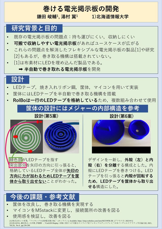 • これらの問題点を解消したフレキシブルな電光掲⽰板の製品[1]や研究 [2]もあるが,巻き取る機構は搭載されていない。 • [1]は布素材にLEDを埋め込んだ製品である。 研究背景と⽬的 設計 ➡ 半⾃動で巻き取れる電光掲⽰板を開発 • LEDテープ,焼き⼊れリボン鋼,筐体,マイコンを⽤いて実装 • 筐体にはLEDテープを半⾃動で巻き取る機構を搭載 • RolBoは⼀⾏のLEDテープを格納しているため,複数組み合わせて使⽤ • 筐体を改良し,巻き取る機構を実現する • マイコンをM5stackに変更し,接続箇所の改善を図る • 使⽤感を検証し,改善を図る 今後の課題・参考⽂献 筐体の設計にはメジャーの内部構造を参考 デザインを⼀新し,外殻(左)と内 殻(右)を分離する構成とした。内 殻にLEDテープを巻きつける。LED テープを引っ張ると内殻が回転する ため,LEDテープを筐体から取り出 せる構造にした。 設計(第6案) 設計(第5案) 緑⾊部がLEDテープを指す 突出部分を⽮印の⽅向に引っ張ると, 格納しているLEDテープ全体が⽮印の ⽅向に⼒が加わるためLEDテープを筐 体から取り出せないことがわかった。 [1] 株式会社シロ産業, “フレキシブルLED電光掲示板,” [オンライン]. Available: https://shop.webshiro.com/item/M2539FB-2R/. [アクセス日: 2023/9/1] [2] 鈴永紗也, 藤田和之, 白井僚, 伊藤雄一, “CoiLED Display: 対象に巻きつけ可能なストライプ状フレキシブルディスプレイ,” 日本バーチャルリアリティ学会論文誌, 2021, Vol.26, No.4, pp.230-240