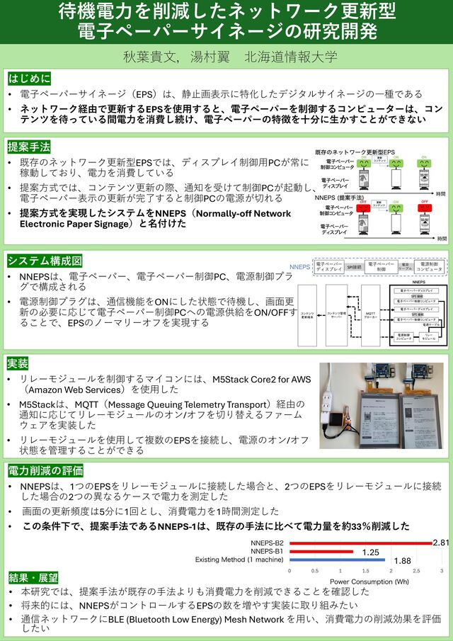 • ネットワーク経由で更新するEPSを使用すると、電子ペーパーを制御するコンピューターは、コン テンツを待っている間電力を消費し続け、電子ペーパーの特徴を十分に生かすことができない 提案手法 • 既存のネットワーク更新型EPSでは、ディスプレイ制御用PCが常に 稼動しており、電力を消費している • 提案方式では、コンテンツ更新の際、通知を受けて制御PCが起動し、 電子ペーパー表示の更新が完了すると制御PCの電源が切れる • 提案方式を実現したシステムをNNEPS(Normally-off Network Electronic Paper Signage)と名付けた システム構成図 • NNEPSは、電子ペーパー、電子ペーパー制御PC、電源制御プラ グで構成される • 電源制御プラグは、通信機能をONにした状態で待機し、画面更 新の必要に応じて電子ペーパー制御PCへの電源供給をON/OFFす ることで、EPSのノーマリーオフを実現する 実装 • リレーモジュールを制御するマイコンには、M5Stack Core2 for AWS (Amazon Web Services)を使用した • M5Stackは、MQTT(Message Queuing Telemetry Transport)経由の 通知に応じてリレーモジュールのオン/オフを切り替えるファーム ウェアを実装した • リレーモジュールを使用して複数のEPSを接続し、電源のオン/オフ 状態を管理することができる 電力削減の評価 • NNEPSは、1つのEPSをリレーモジュールに接続した場合と、2つのEPSをリレーモジュールに接続 した場合の2つの異なるケースで電力を測定した • 画面の更新頻度は5分に1回とし、消費電力を1時間測定した • この条件下で、提案手法であるNNEPS-1は、既存の手法に比べて電力量を約33%削減した 結果・展望 • 本研究では、提案手法が既存の手法よりも消費電力を削減できることを確認した • 将来的には、NNEPSがコントロールするEPSの数を増やす実装に取り組みたい • 通信ネットワークにBLE (Bluetooth Low Energy) Mesh Network を用い、消費電力の削減効果を評価 したい