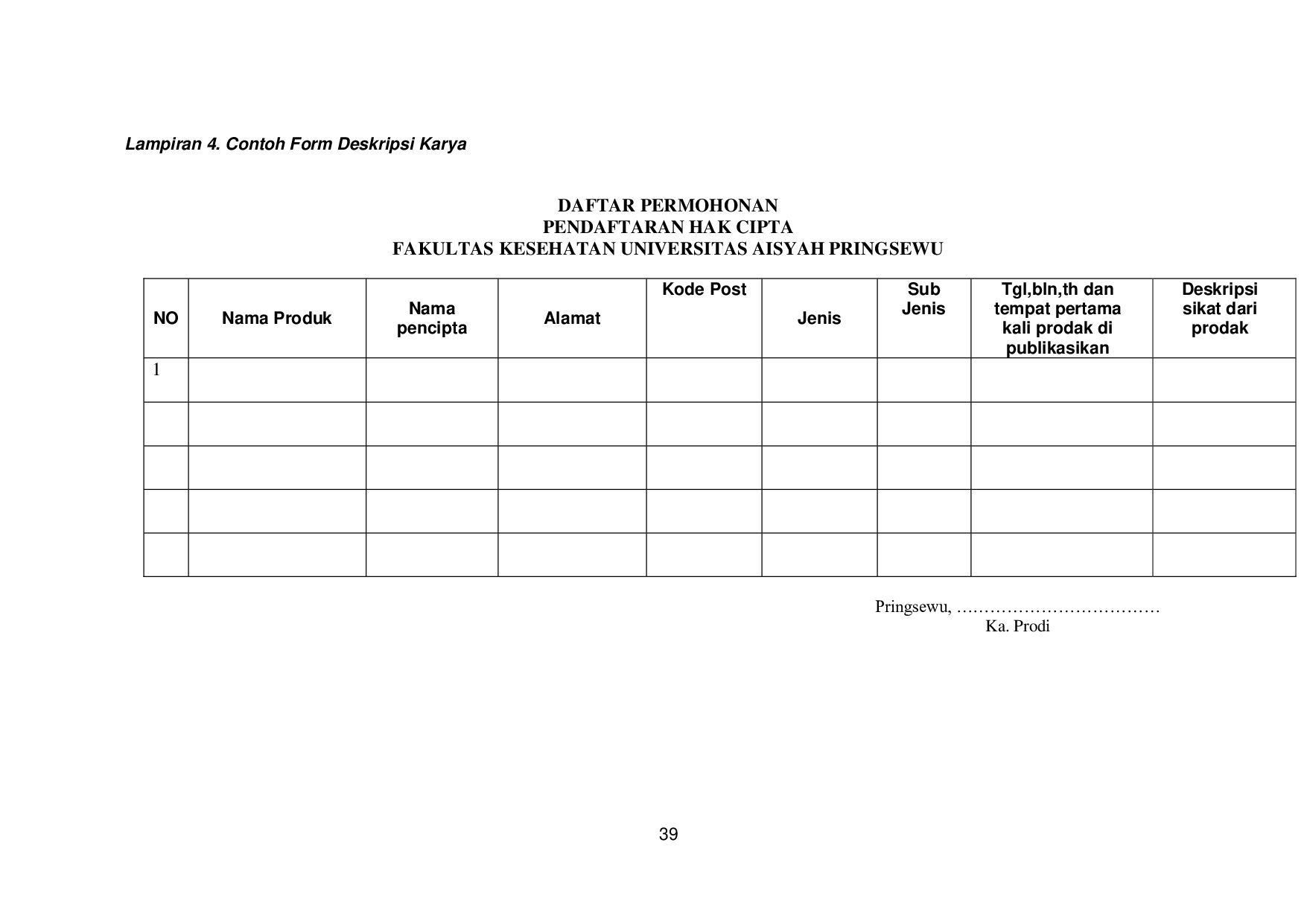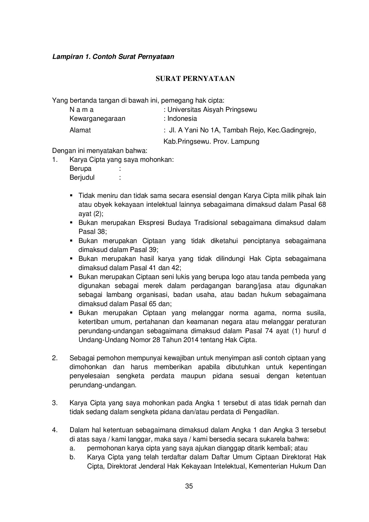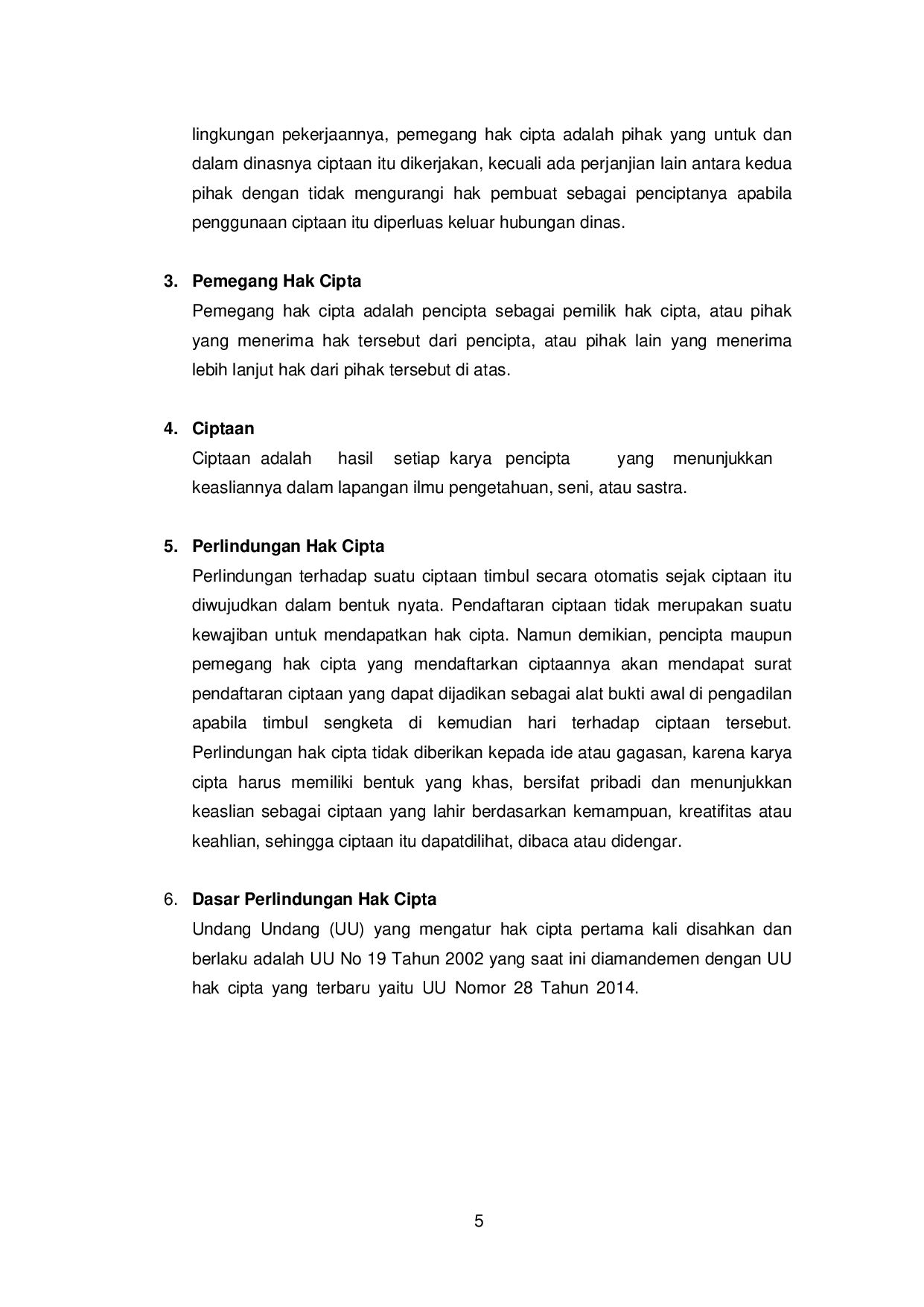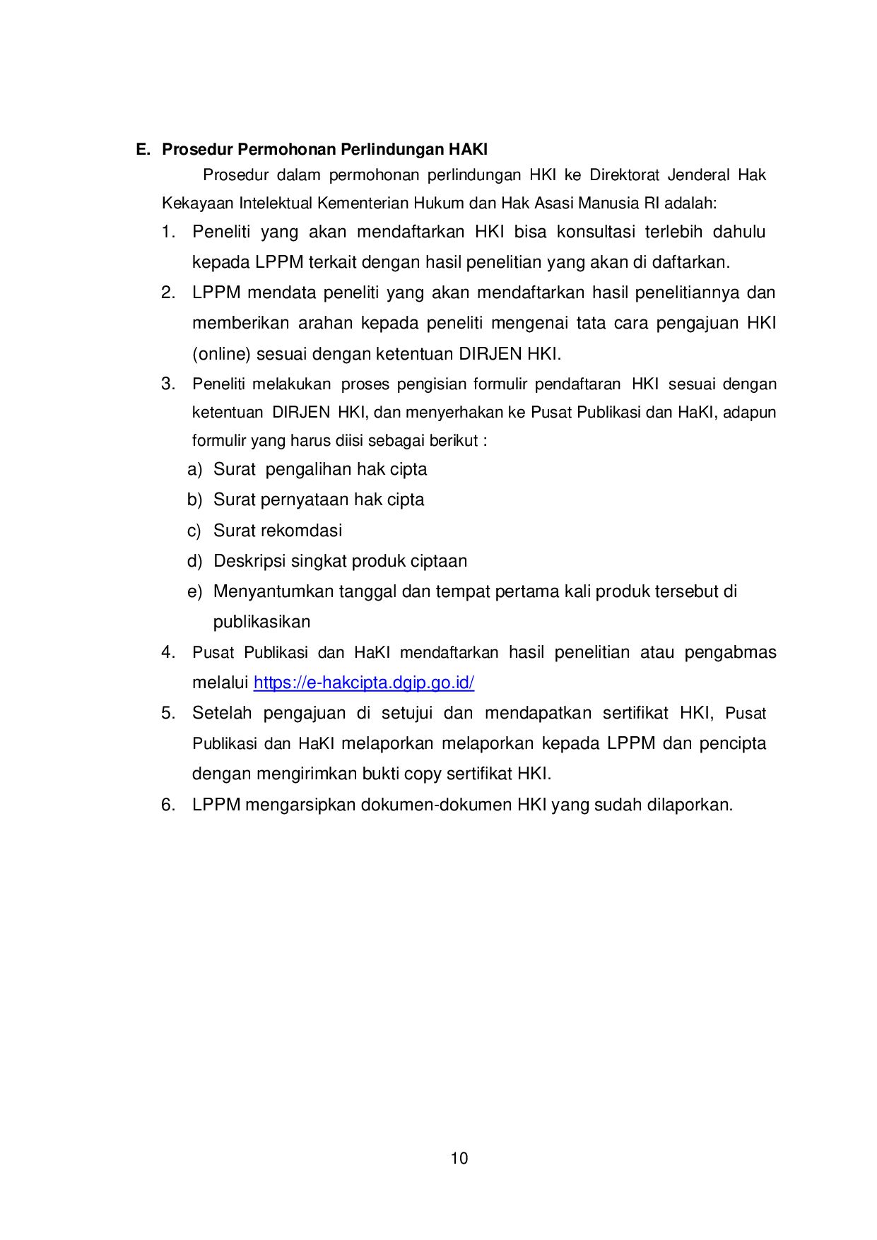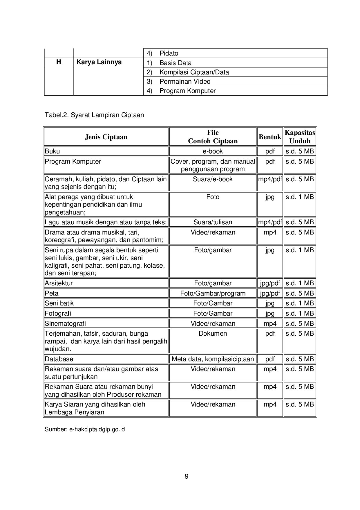 Kompilasi Ciptaan/Data 3) Permainan Video 4) Program Komputer Tabel.2. Syarat Lampiran Ciptaan Jenis Ciptaan File Contoh Ciptaan Bentuk Kapasitas Unduh Buku e-book pdf s.d. 5 MB Program Komputer Cover, program, dan manual penggunaan program pdf s.d. 5 MB Ceramah, kuliah, pidato, dan Ciptaan lain yang sejenis dengan itu; Suara/e-book mp4/pdf s.d. 5 MB Alat peraga yang dibuat untuk kepentingan pendidikan dan ilmu pengetahuan; Foto jpg s.d. 1 MB Lagu atau musik dengan atau tanpa teks; Suara/tulisan mp4/pdf s.d. 5 MB Drama atau drama musikal, tari, koreografi, pewayangan, dan pantomim; Video/rekaman mp4 s.d. 5 MB Seni rupa dalam segala bentuk seperti seni lukis, gambar, seni ukir, seni kaligrafi, seni pahat, seni patung, kolase, dan seni terapan; Foto/gambar jpg s.d. 1 MB Arsitektur Foto/gambar jpg/pdf s.d. 1 MB Peta Foto/Gambar/program jpg/pdf s.d. 5 MB Seni batik Foto/Gambar jpg s.d. 1 MB Fotografi Foto/Gambar jpg s.d. 1 MB Sinematografi Video/rekaman mp4 s.d. 5 MB Terjemahan, tafsir, saduran, bunga rampai, dan karya lain dari hasil pengalih wujudan. Dokumen pdf s.d. 5 MB Database Meta data, kompilasiciptaan pdf s.d. 5 MB Rekaman suara dan/atau gambar atas suatu pertunjukan Video/rekaman mp4 s.d. 5 MB Rekaman Suara atau rekaman bunyi yang dihasilkan oleh Produser rekaman Video/rekaman mp4 s.d. 5 MB Karya Siaran yang dihasilkan oleh Lembaga Penyiaran Video/rekaman mp4 s.d. 5 MB Sumber: e-hakcipta.dgip.go.id