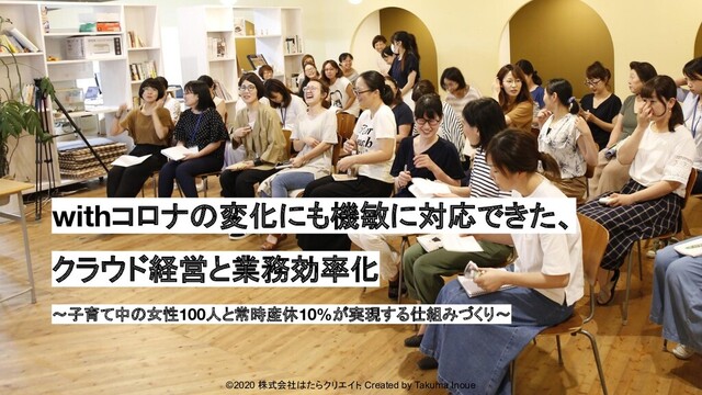 withコロナの変化にも機敏に対応できた、 クラウド経営と業務効率化 ~子育て中の女性100人と常時産休10%が実現する仕組みづくり~ ©2020 株式会社はたらクリエイト , Created by Takuma Inoue