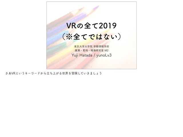 東大VRサークル「UT-virtual」の新入生向けに行った100分の講義で使用したスライド。 VRというキーワードを手がかりに、概念、コンテンツ、テクノロジー、開発知見、学術、歴史などを包括的に話しました。