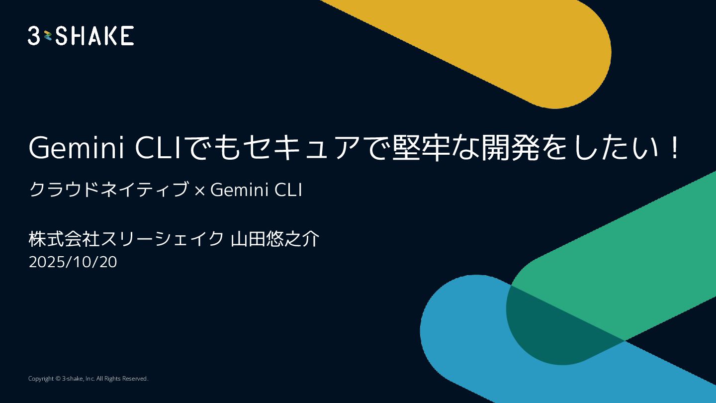 Gemini CLIでもセキュアで堅牢な開発をしたい! クラウドネイティブ × Gemini CLI 株式会社スリーシェイク 山田悠之介 2025/10/20 Copyright