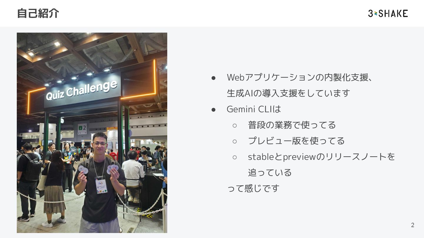 自己紹介 • Webアプリケーションの内製化支援、 生成AIの導入支援をしています • Gemini CLIは ◦ 普段の業務で使ってる ◦