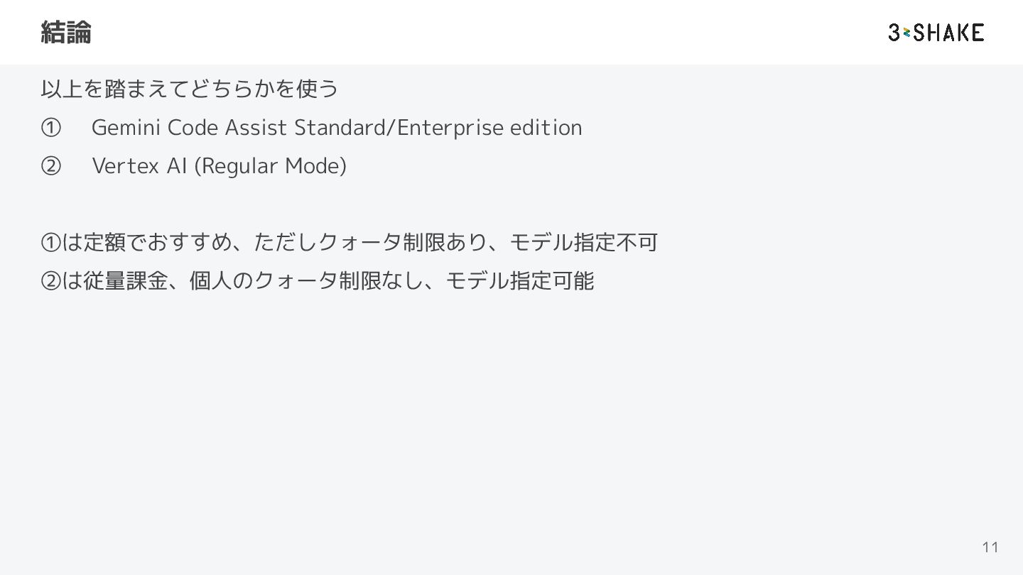 結論 以上を踏まえてどちらかを使う ① Gemini Code Assist Standard/Enterprise edition ② Vertex