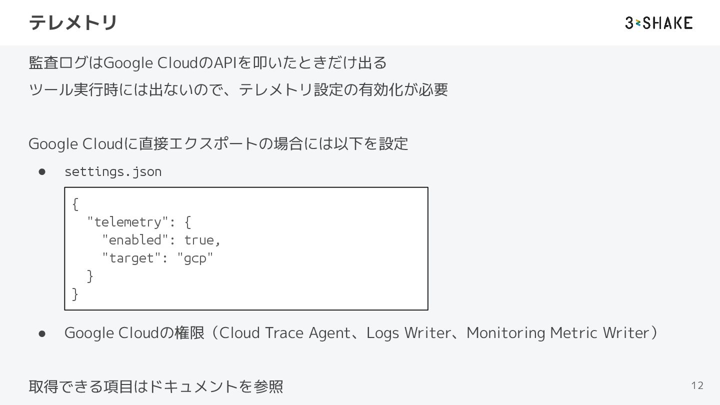 Cloudの権限(Cloud Trace Agent、Logs Writer、Monitoring Metric Writer) 取得できる項目はドキュメントを参照 12 { "telemetry": { "enabled": true, "target": "gcp" } }