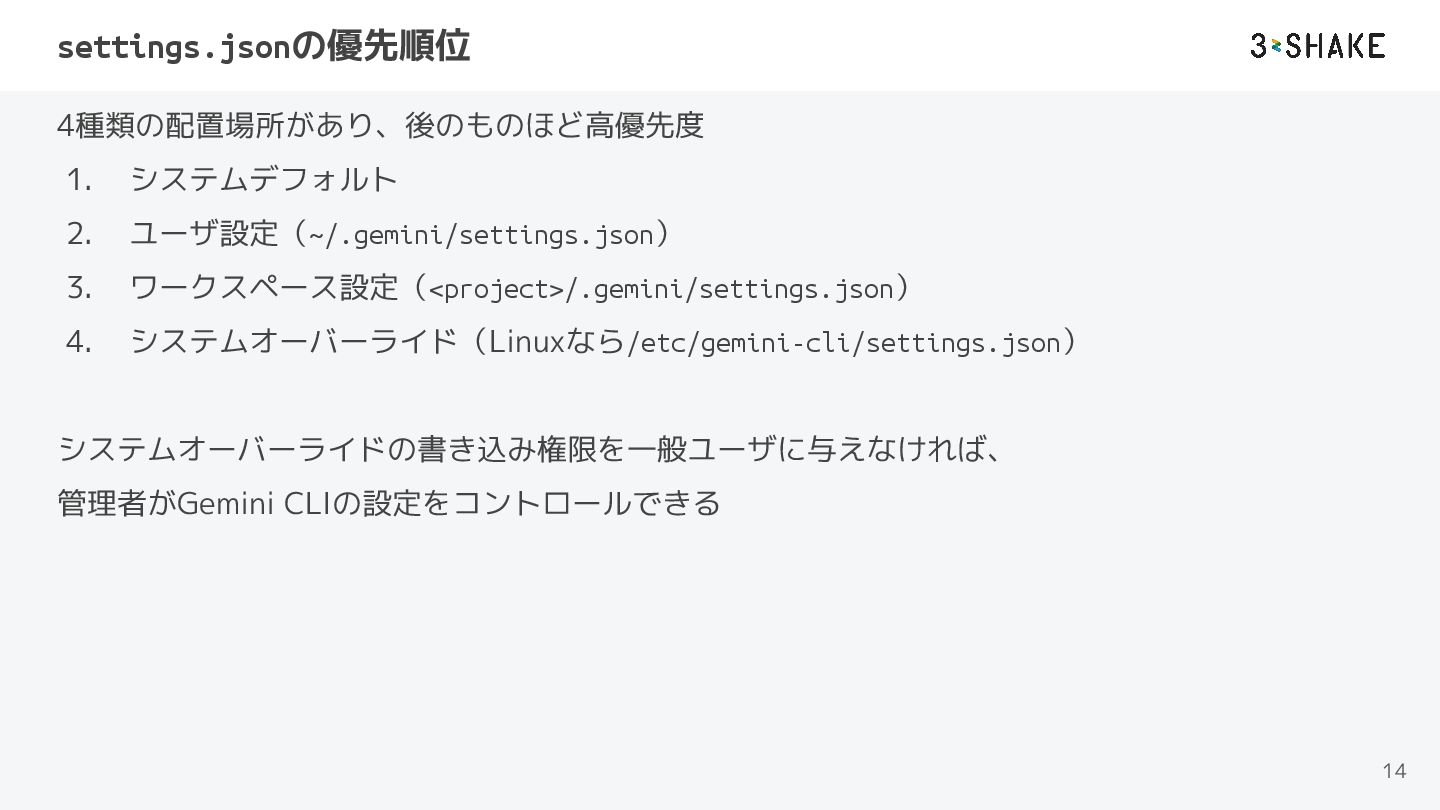 システムオーバーライドの書き込み権限を一般ユーザに与えなければ、 管理者がGemini CLIの設定をコントロールできる 14