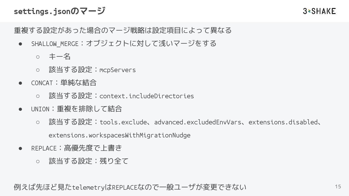 settings.jsonのマージ 重複する設定があった場合のマージ戦略は設定項目によって異なる • SHALLOW_MERGE:オブジェクトに対して浅いマージをする ◦ キー名が同じ場合は高優先度で上書き ◦ 該当する設定:mcpServers • CONCAT:単純な結合