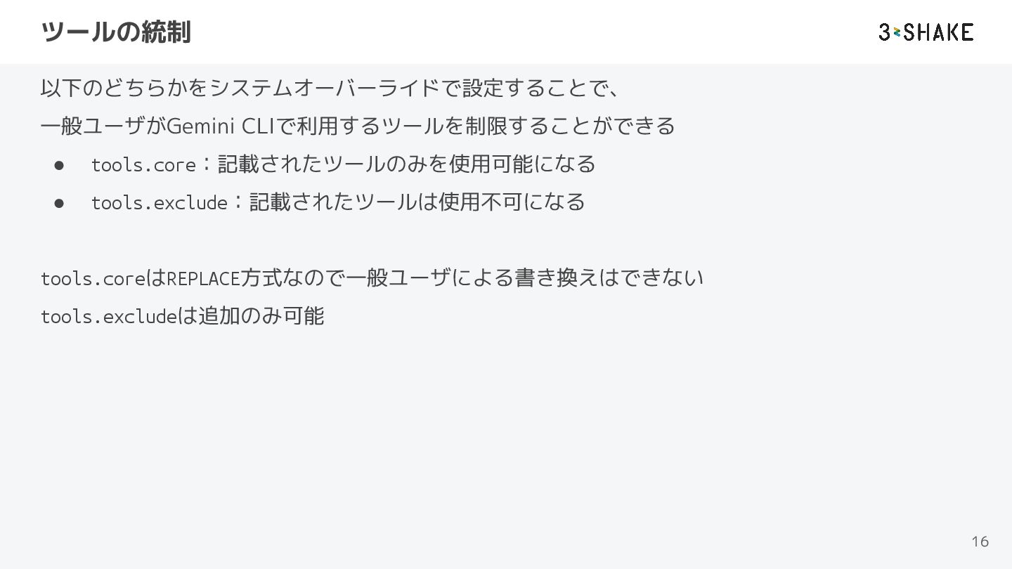 ツールの統制 以下のどちらかをシステムオーバーライドで設定することで、 一般ユーザがGemini CLIで利用するツールを制限することができる • tools.core:記載されたツールのみを使用可能になる • tools.exclude:記載されたツールは使用不可になる tools.coreはREPLACE方式なので一般ユーザによる書き換えはできない tools.excludeは追加のみ可能
