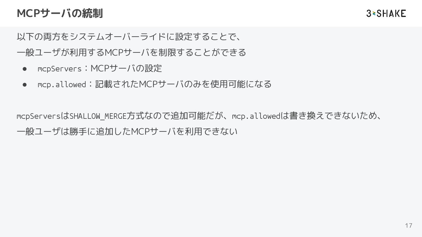 MCPサーバの統制 以下の両方をシステムオーバーライドに設定することで、 一般ユーザが利用するMCPサーバを制限することができる • mcpServers:MCPサーバの設定 • mcp.allowed:記載されたMCPサーバのみを使用可能になる mcpServersはSHALLOW_MERGE方式なので追加可能だが、mcp.allowedは書き換えできないため、 一般ユーザは勝手に追加したMCPサーバを利用できない 17