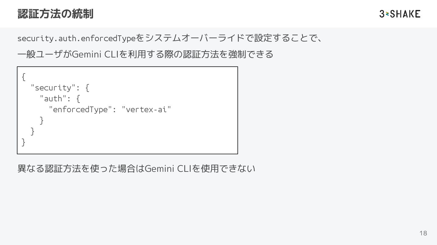 認証方法の統制 security.auth.enforcedTypeをシステムオーバーライドで設定することで、 一般ユーザがGemini CLIを利用する際の認証方法を強制できる 異なる認証方法を使った場合はGemini CLIを使用できない 18 { "security": {