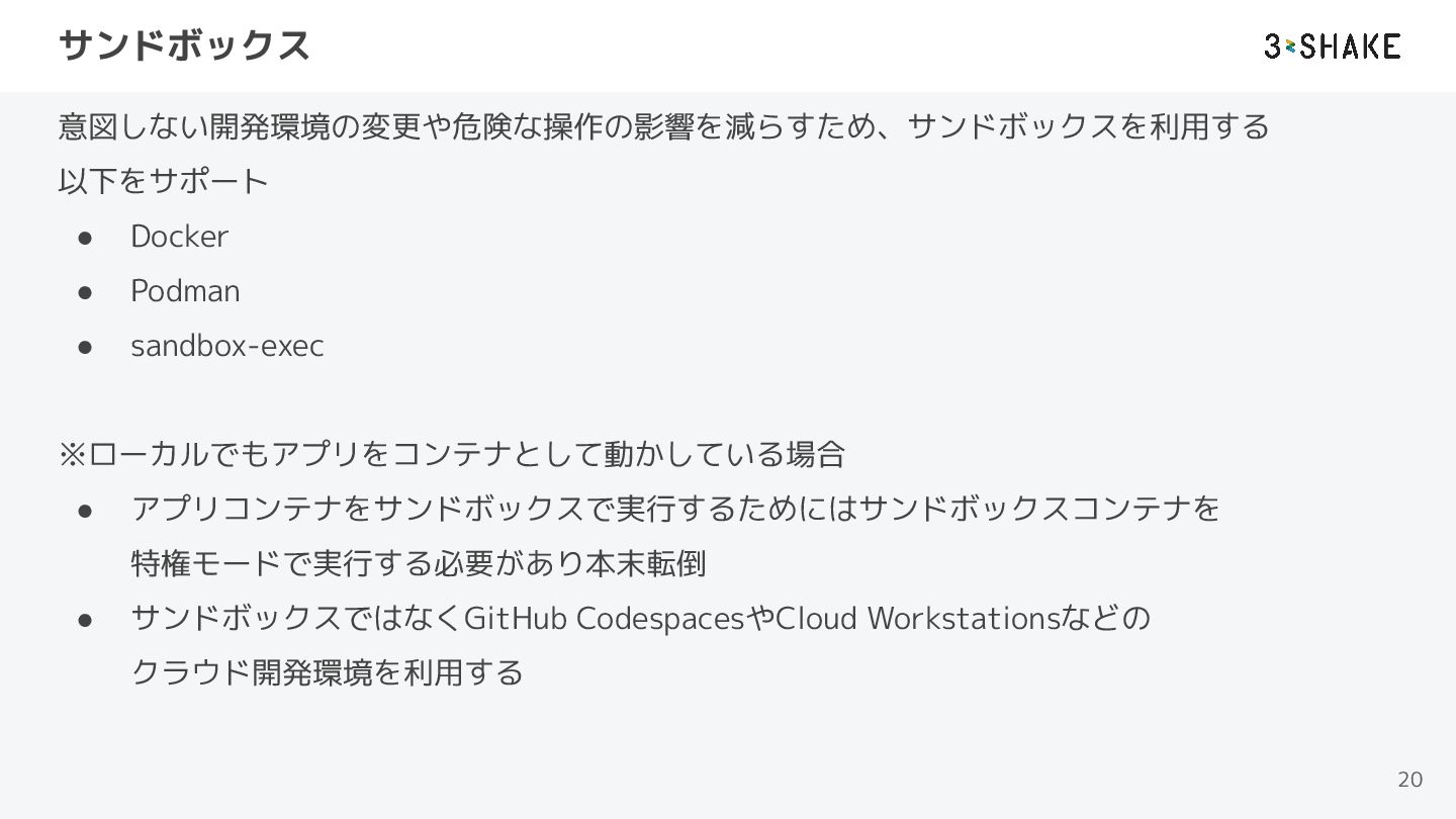 サンドボックス 意図しない開発環境の変更や危険な操作の影響を減らすため、サンドボックスを利用する 以下をサポート • Docker • Podman • sandbox-exec ※ローカルでもアプリをコンテナとして動かしている場合