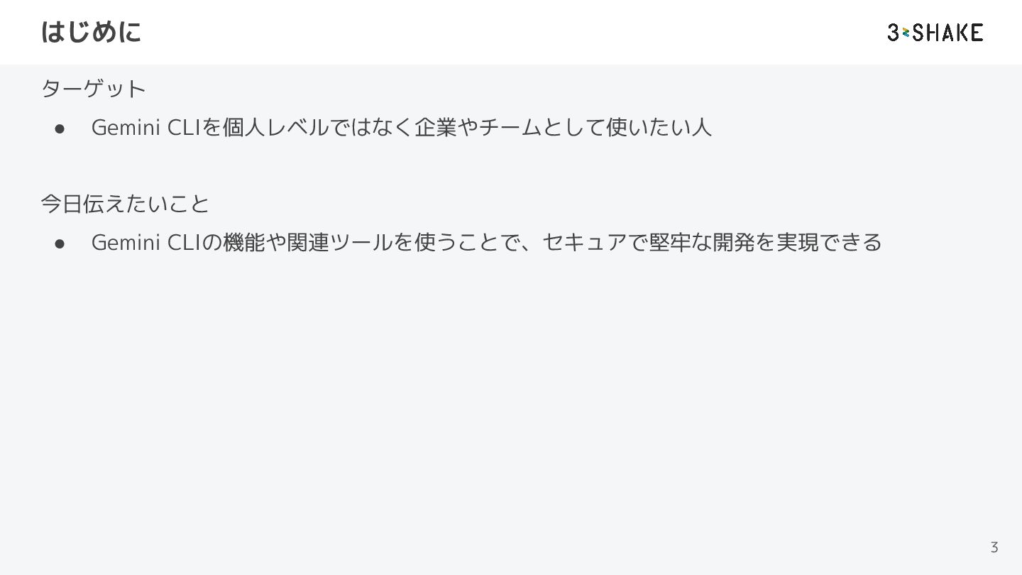 はじめに ターゲット • Gemini CLIを個人レベルではなく企業やチームとして使いたい人 今日伝えたいこと • Gemini CLIの機能や関連ツールを使うことで、セキュアで堅牢な開発を実現できる 3
