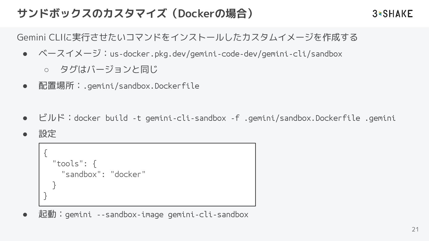 サンドボックスのカスタマイズ(Dockerの場合) Gemini CLIに実行させたいコマンドをインストールしたカスタムイメージを作成する • ベースイメージ:us-docker.pkg.dev/gemini-code-dev/gemini-cli/sandbox ◦ タグはバージョンと同じ • 配置場所:.gemini/sandbox.Dockerfile •