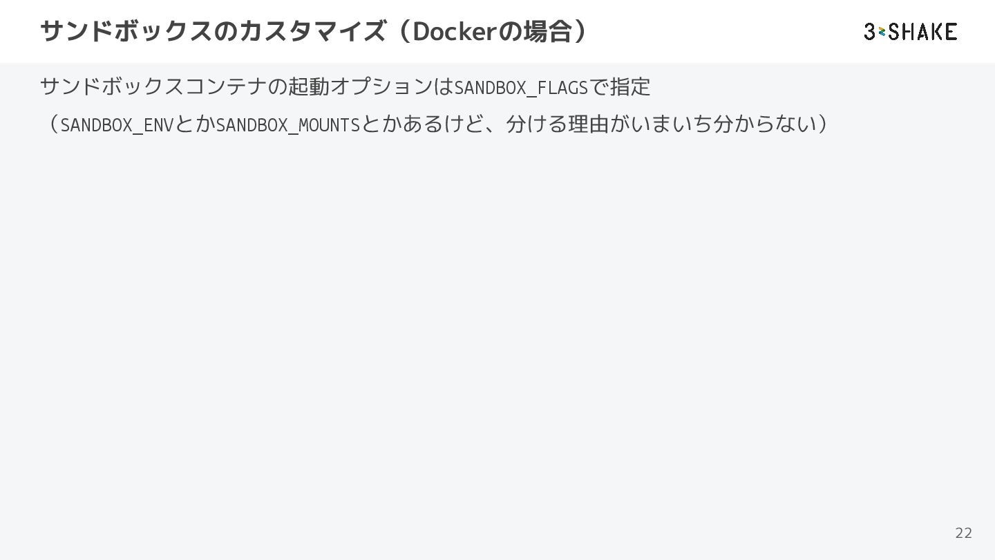 サンドボックスのカスタマイズ(Dockerの場合) サンドボックスコンテナの起動オプションはSANDBOX_FLAGSで指定 (SANDBOX_ENVとかSANDBOX_MOUNTSとかあるけど、分ける理由がいまいち分からない) 22