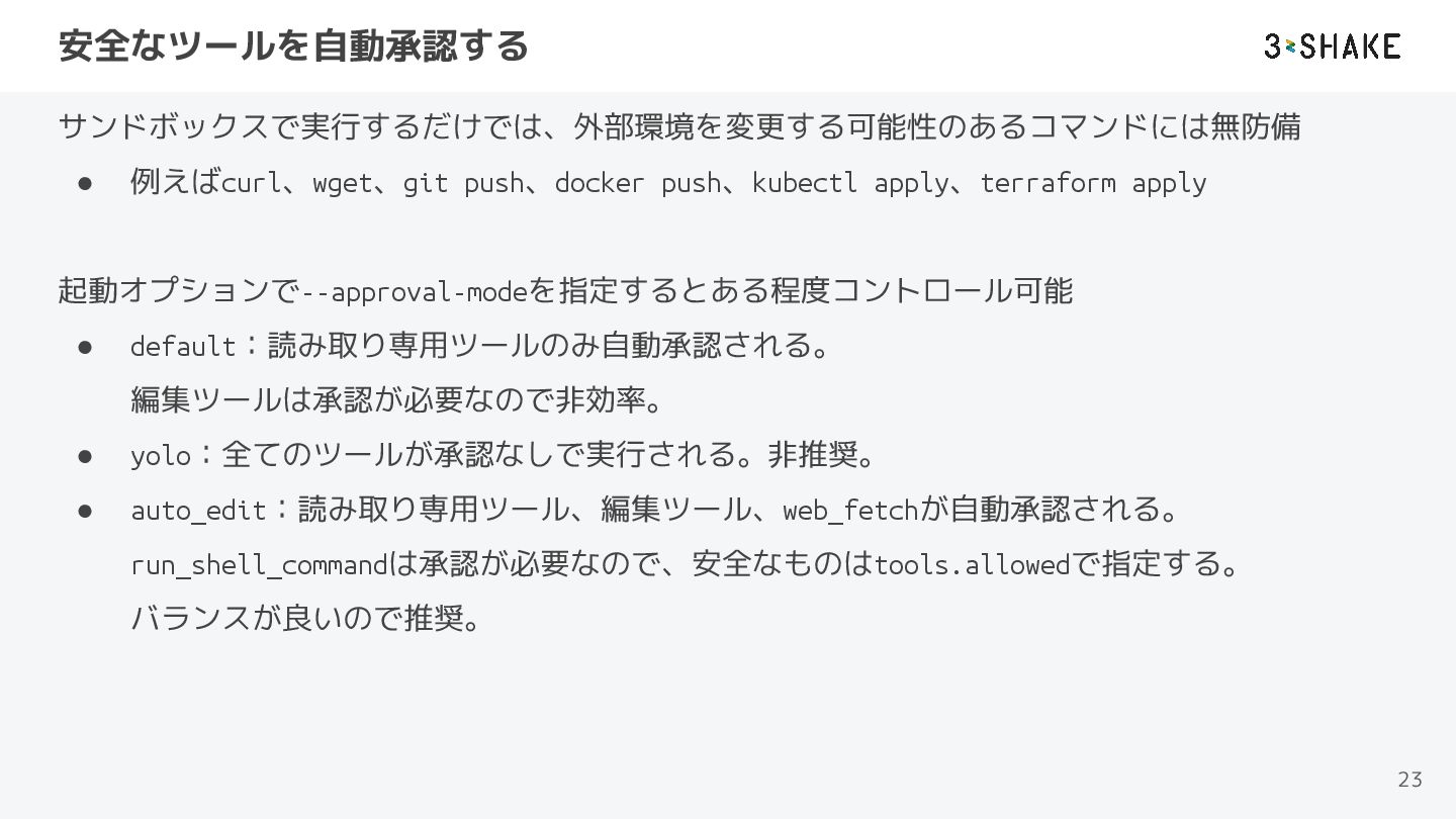 default:読み取り専用ツールのみ自動承認される。 編集ツールは承認が必要なので非効率。 • yolo:全てのツールが承認なしで実行される。非推奨。 • auto_edit:読み取り専用ツール、編集ツール、web_fetchが自動承認される。 run_shell_commandは承認が必要なので、安全なものはtools.allowedで指定する。 バランスが良いので推奨。 23