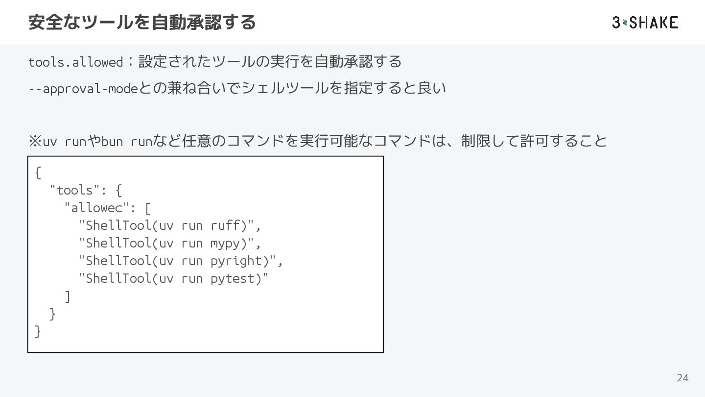 安全なツールを自動承認する tools.allowed:設定されたツールの実行を自動承認する --approval-modeとの兼ね合いでシェルツールを指定すると良い ※uv runやbun runなど任意のコマンドを実行可能なコマンドは、制限して許可すること 24 { "tools": {