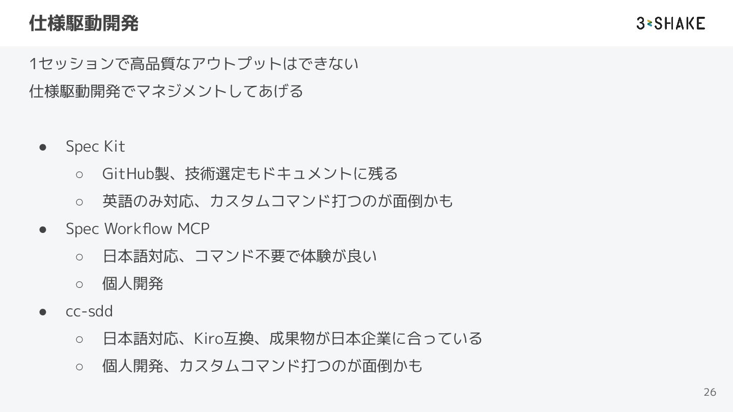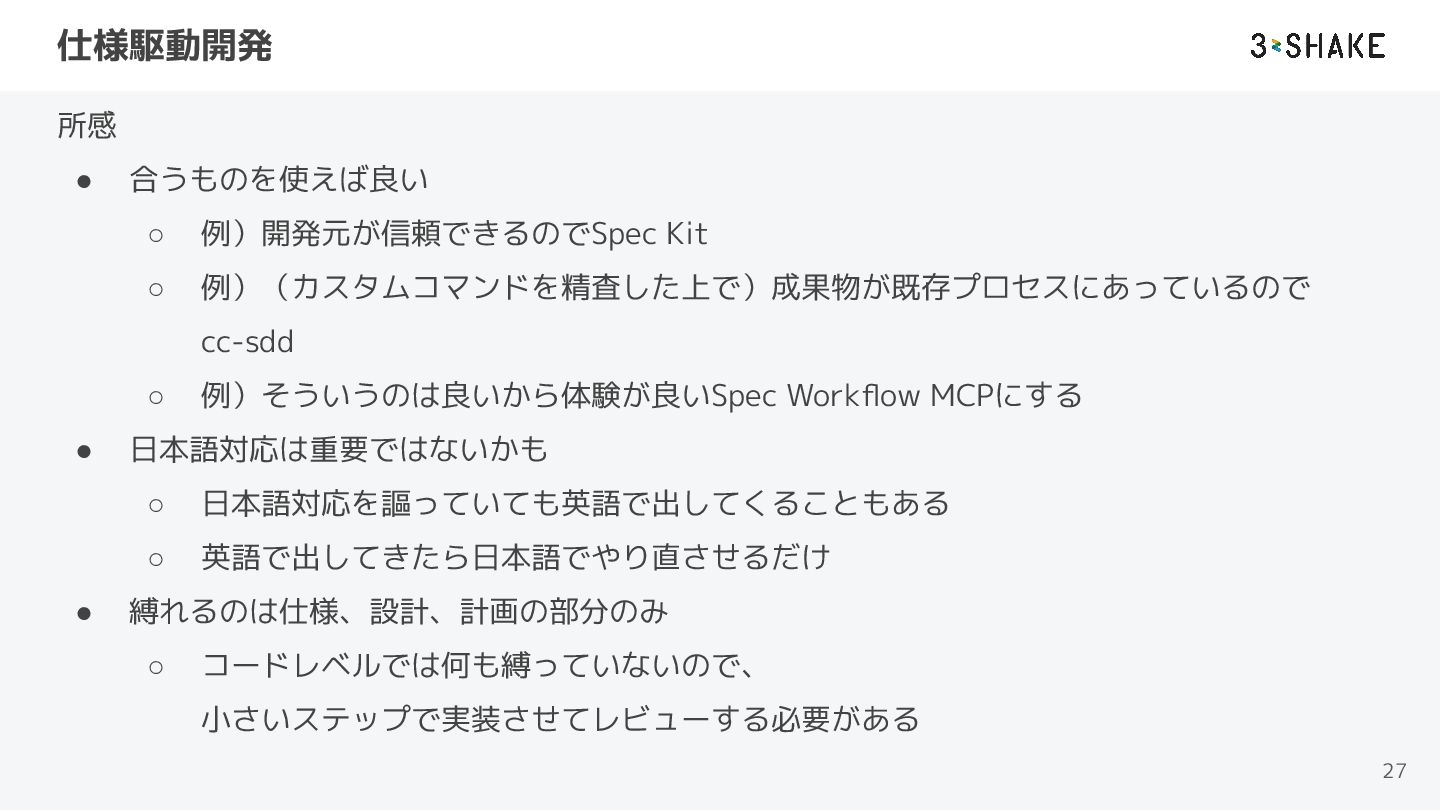 • Spec Workflow MCP ◦ 日本語対応、コマンド不要で体験が良い ◦ 個人開発 • cc-sdd ◦ 日本語対応、Kiro互換、成果物が日本企業に合っている ◦ 個人開発、カスタムコマンド打つのが面倒かも 26