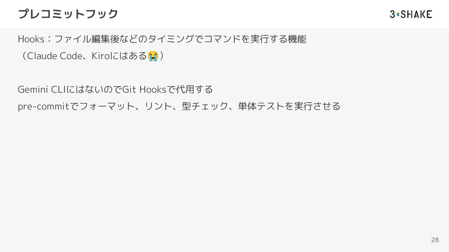 プレコミットフック Hooks:ファイル編集後などのタイミングでコマンドを実行する機能 (Claude Code、Kiroにはある😭) Gemini CLIにはないのでGit Hooksで代用する pre-commitでフォーマット、リント、型チェック、単体テストを実行させる 28