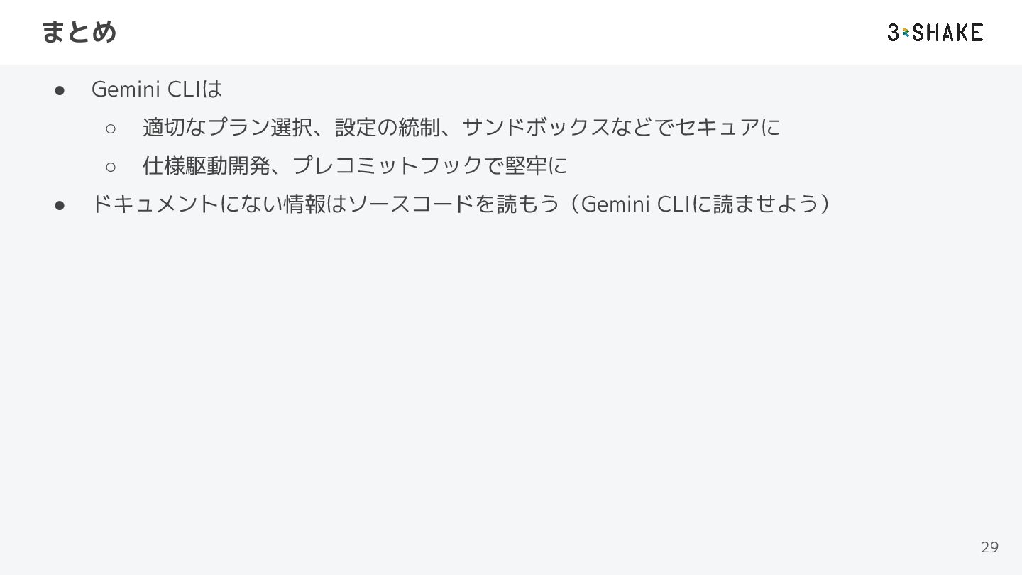 まとめ • Gemini CLIは ◦ 適切なプラン選択、設定の統制、サンドボックスなどでセキュアに ◦ 仕様駆動開発、プレコミットフックで堅牢に • ドキュメントにない情報はソースコードを読もう(Gemini